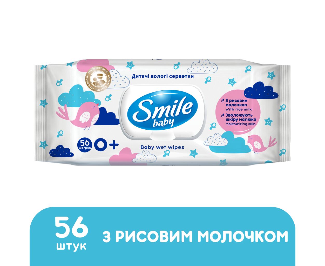 Дитячі вологі серветки Smile baby з рисовим молочком, 56 шт (4823071649215)