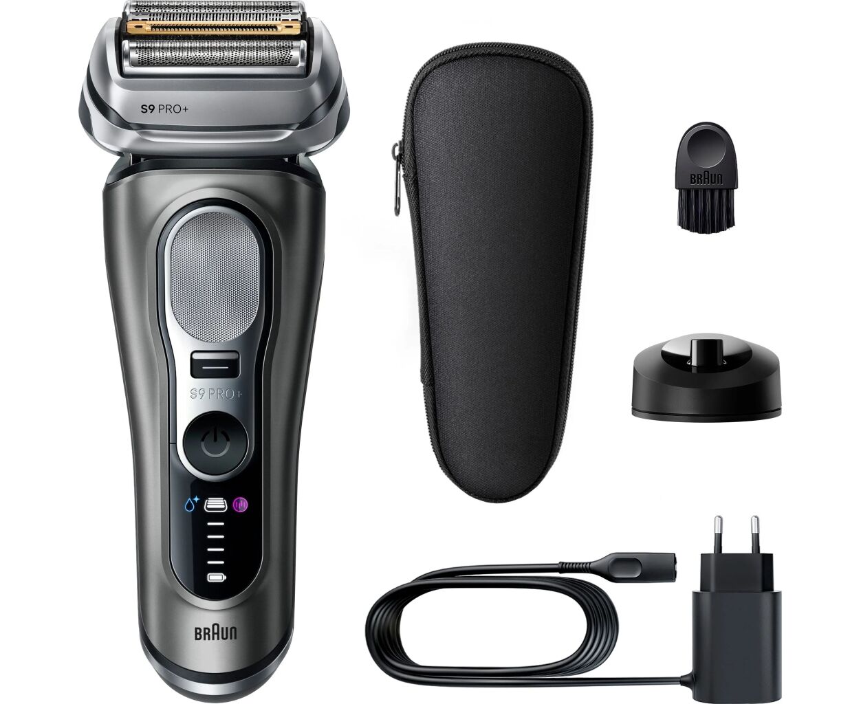 Вміст коробки: 1 бритва Braun Series 9 PRO+, 1 дорожній футляр, 1 зарядний пристрій, 1 щіточка для очищення, 1 підставка для заряджання.