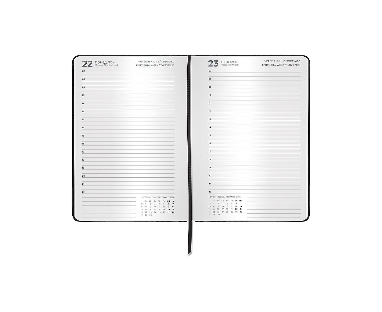 датований, А5, кількість листів - 168, 70 г/м², колір паперу - білий, PU, Колір - чорний, 14.5 х 2 х 21 см, 2026, українська, англійська