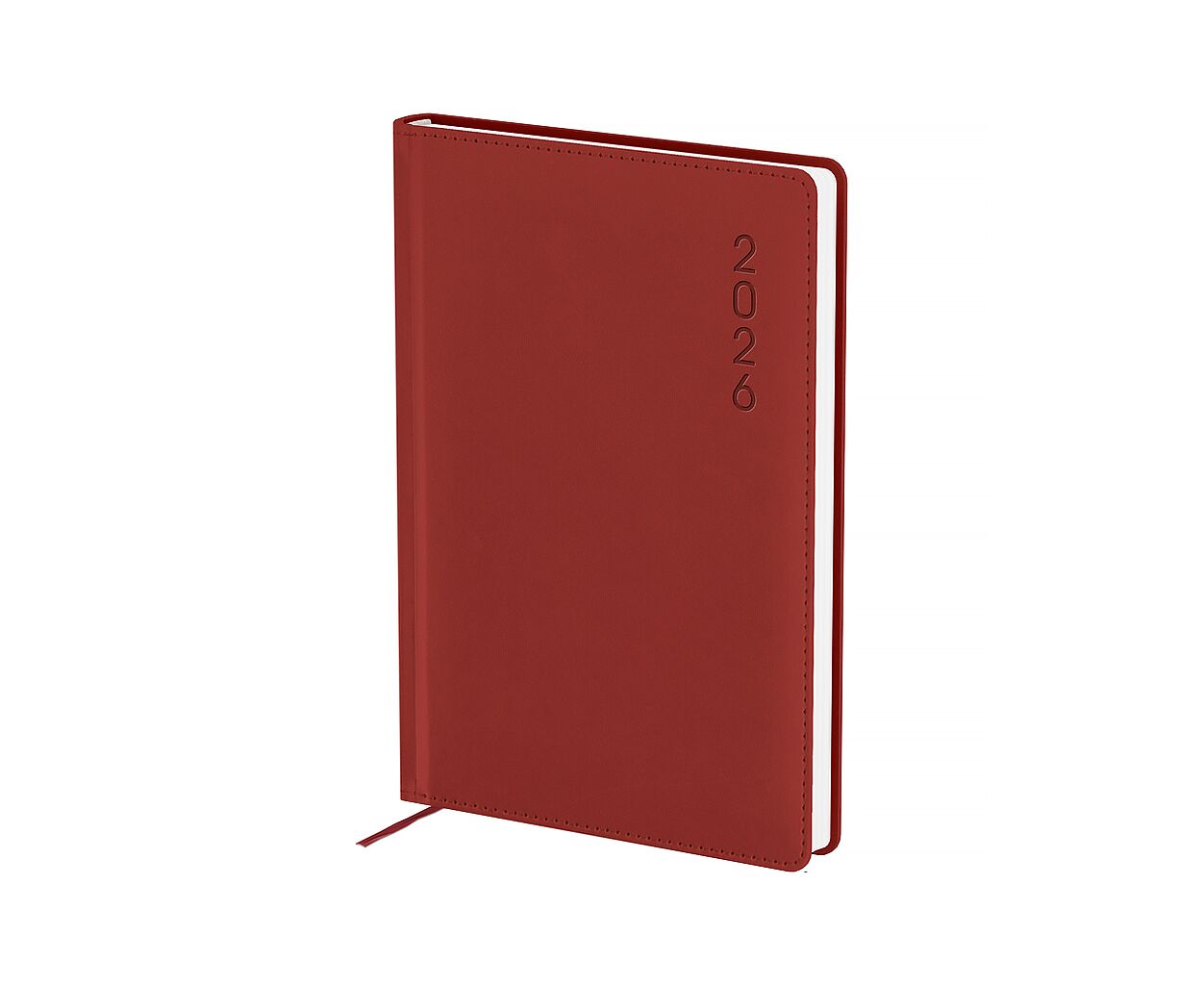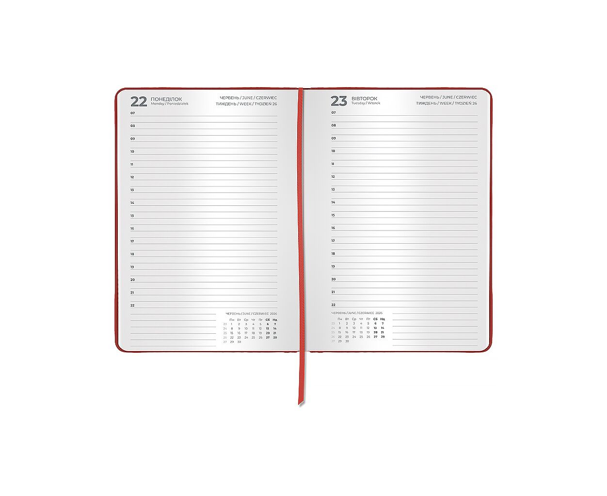 датований, А5, кількість листів - 168, 70 г/м², колір паперу - білий, PU, Колір - червоний, 14.5 х 2 х 21 см, 2026, українська, англійська