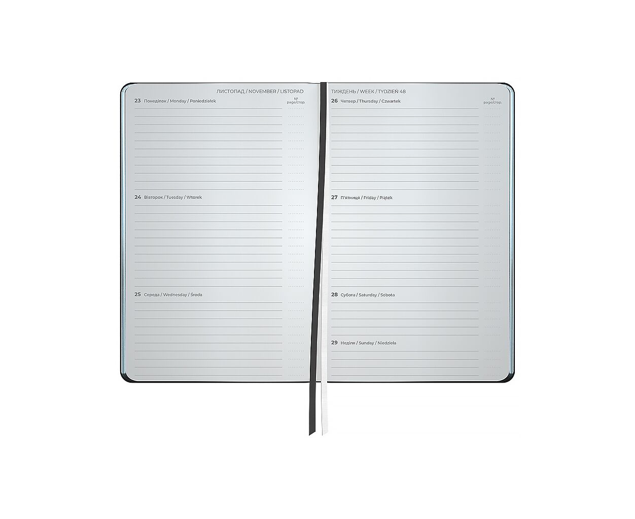 датований, А5, кількість листів - 96, 80 г/м², колір паперу - кремовий, PU, Колір - чорний, 12.5 х 2 х 19.5 см, 2026, українська, англійська