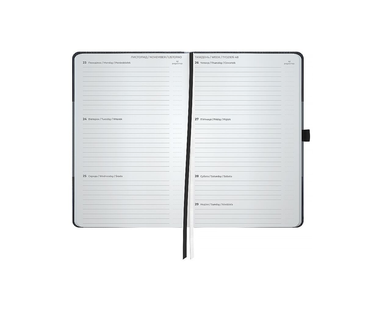 датований, А5, кількість листів - 96, 80 г/м², колір паперу - кремовий, PU, Колір - чорний, 12.5 х 2 х 19.5 см, 2026, українська, англійська