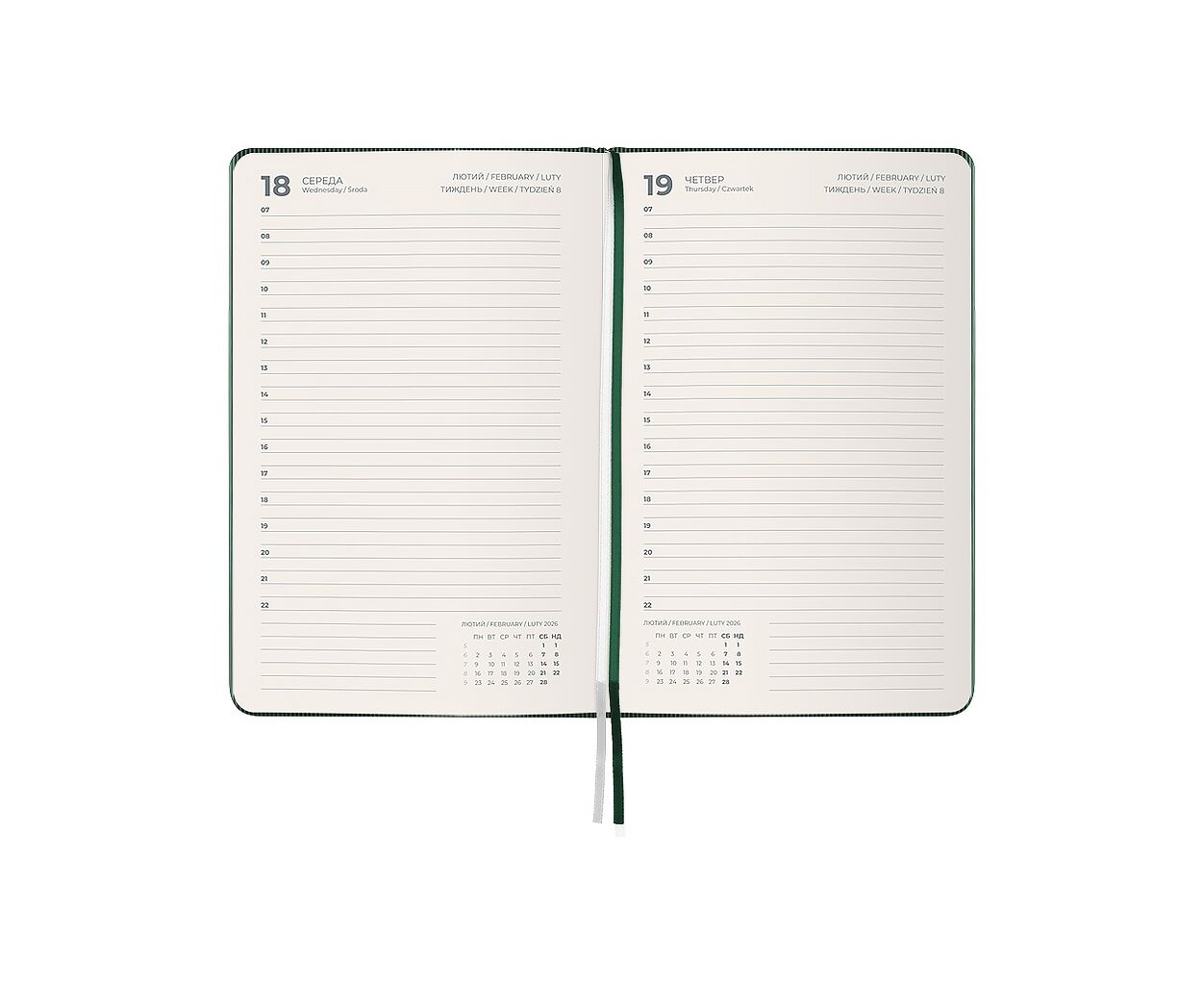 датований, А5, кількість листів - 168, 80 г/м², колір паперу - кремовий, PU, Колір - темно-зелений, 14.5 х 2 х 21 см, 2026, українська, англійська