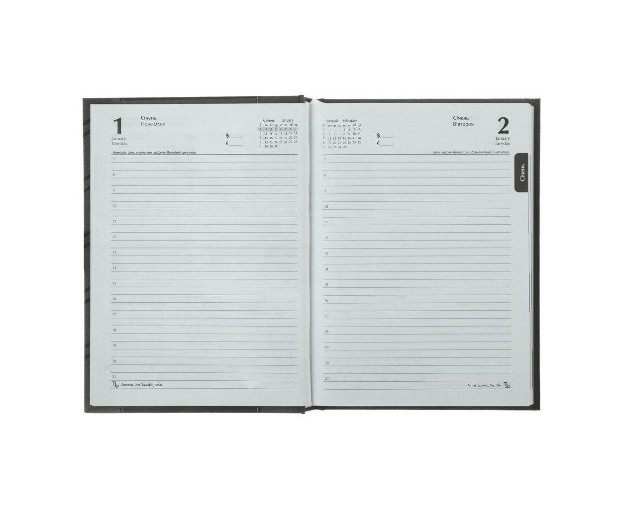 • Датована сторінка на кожен день року з організатором часу від 7:00 до 21:00, календарем на поточний/наступний місяць, позначенням дня тижня, знаку зодіаку, іменинників
