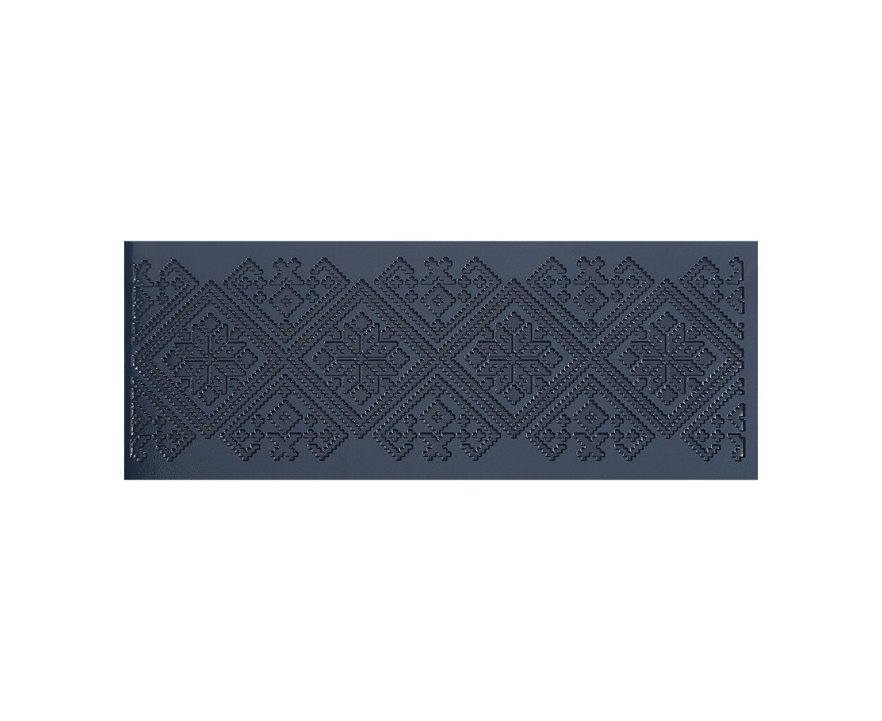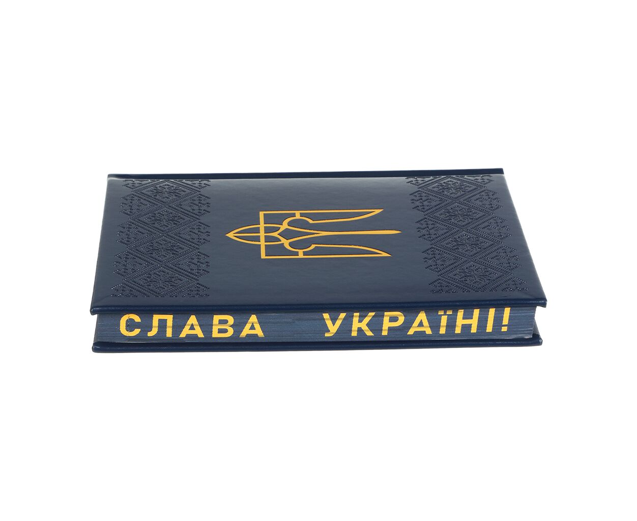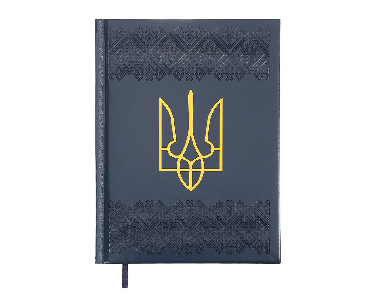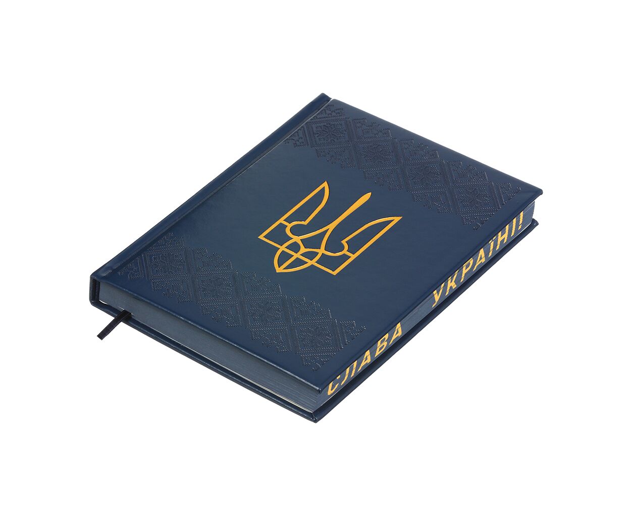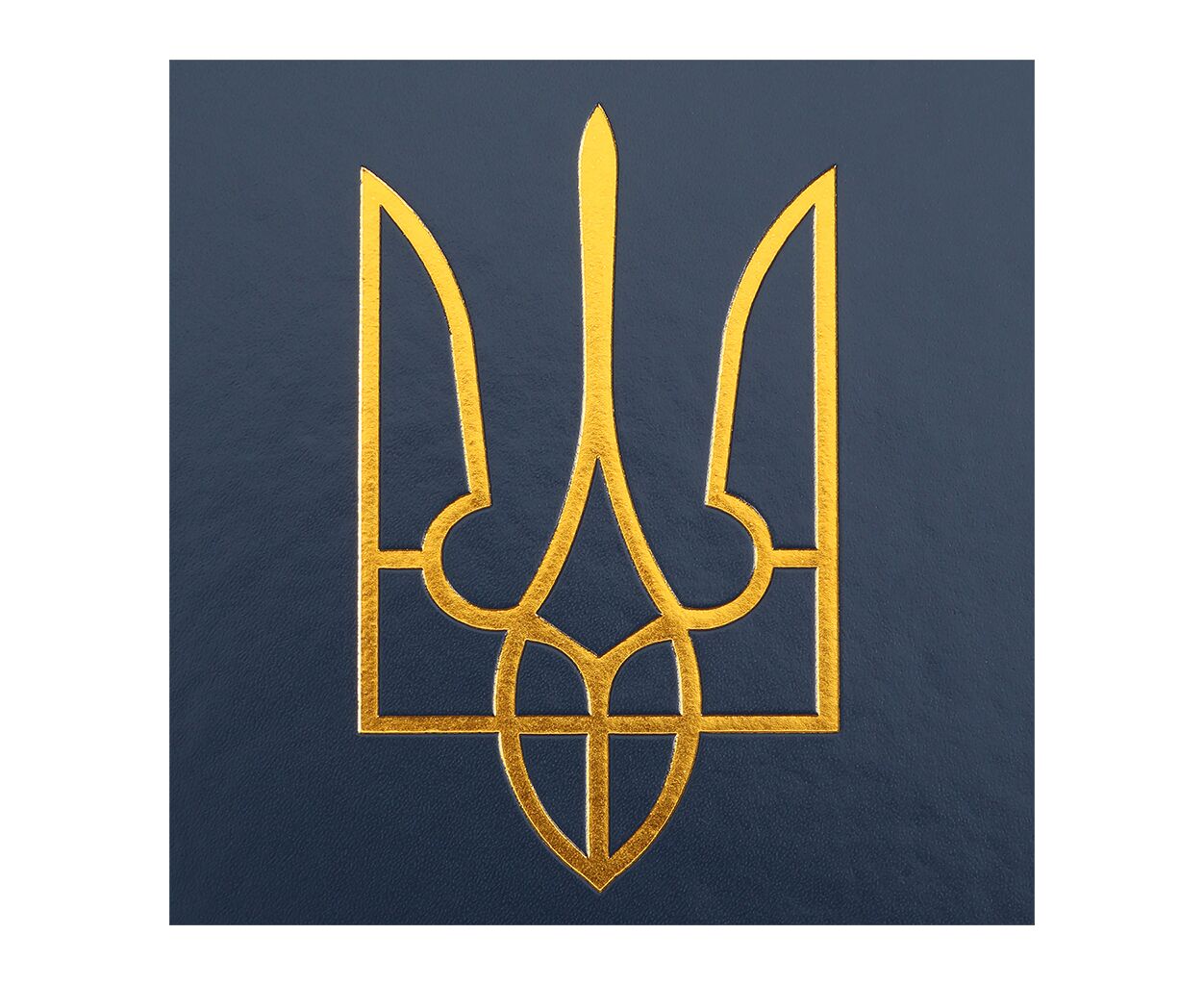 Жорстка обкладинка з гладкої штучної шкіри з поролоном щоденника HERALDRY виконана в патріотичному стилі: має оздоблення українським орнаментом, виконаним сліпим тисненням та тиснення Герба України золотою фольгою. Гармонійно доповнює дизайн щоденника тонований в колір обкладинки зріз внутрішнього блоку з написом СЛАВА УКРАЇНІ та тиснення року на корінці.