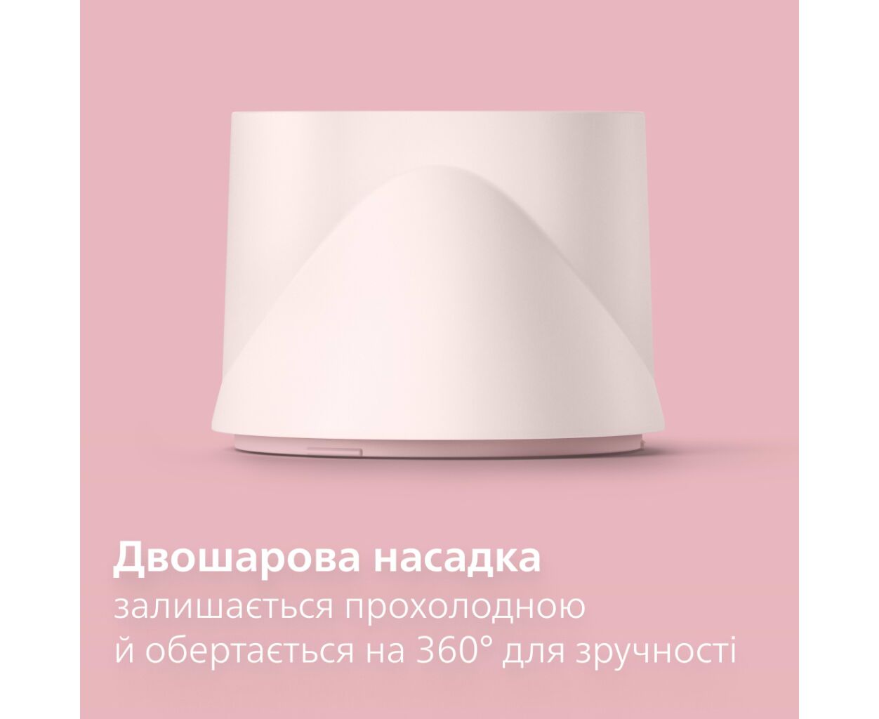 Двошарова насадка для комфортного вкладання волоссяНасадка для укладки має два шари, щоб залишатися холодною, поки ви сушите волосся. Вона ергономічна та обертається на 360°, що дозволяє знайти ідеальний кут для укладання.