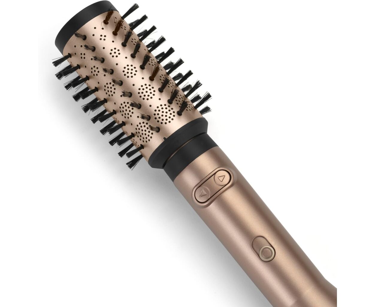 Фен-щітка Babyliss Big Hair Dual поєднує сушіння й укладання в одному приладі. Дві обертові керамічні насадки діаметром 50 і 40 мм дають змогу формувати природну хвилю, спіральні локони та прикореневий об’єм. Механічне керування з 2 температурними режимами й 1 швидкістю, іонізація, подача холодного повітря та захист від перегрівання дають змогу налаштовувати укладку під різні типи волосся. Довгий шарнірний шнур 2,5 м спрощує роботу, а корпус у золотистому кольорі зручний для щоденного використання.
