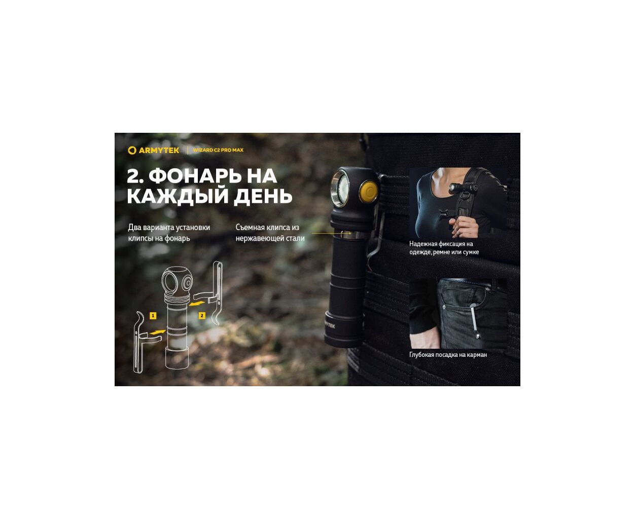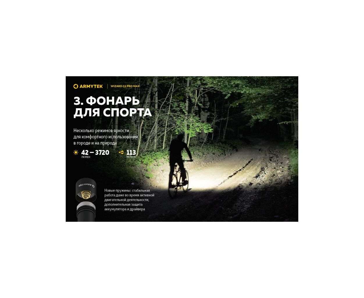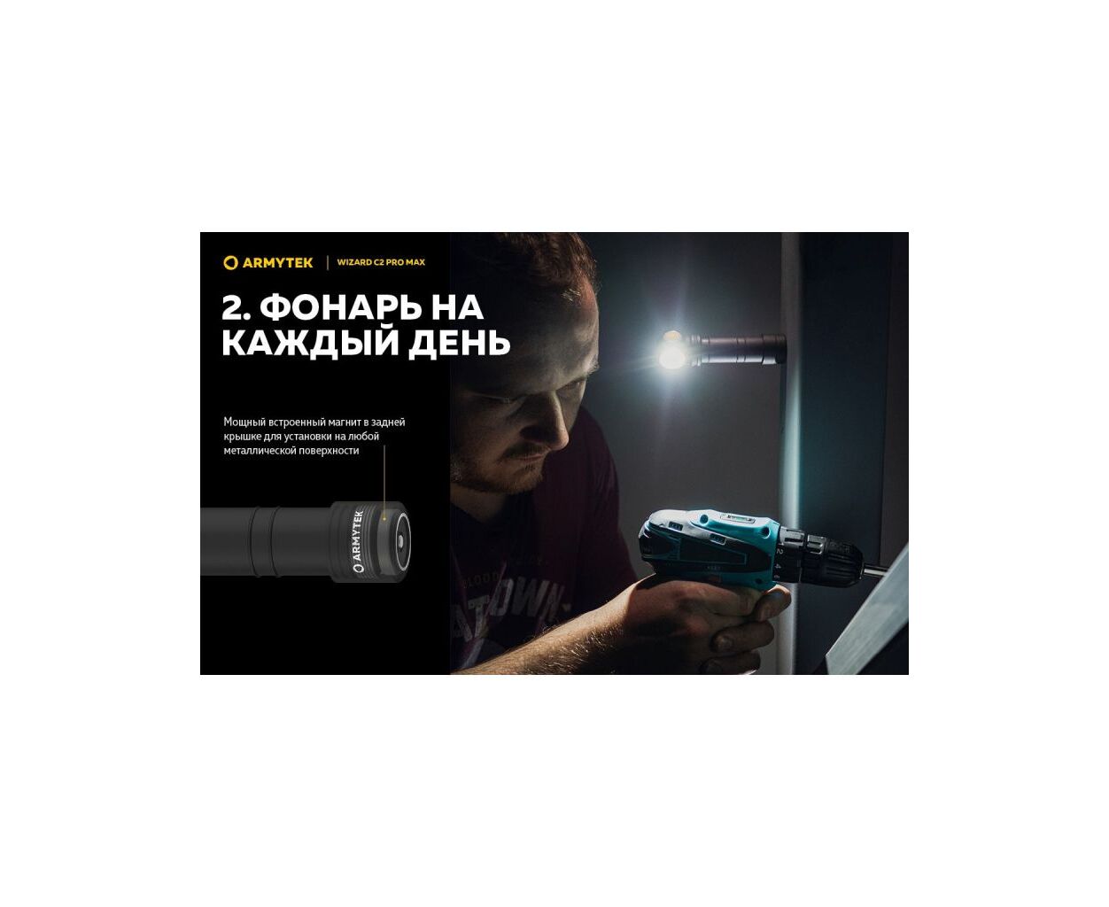 З Armytek Wizard C2 Pro Max ви отримуєте не просто ліхтар, а справжній мультиінструмент освітлення, який стане незамінним для походів, велосипедних прогулянок, спеціальних індустріальних завдань, а також у повсякденних побутових умовах. Насолоджуйтесь якістю світла, надійністю та бездоганним дизайном, що підкреслює ваш стиль жити яскравіше!