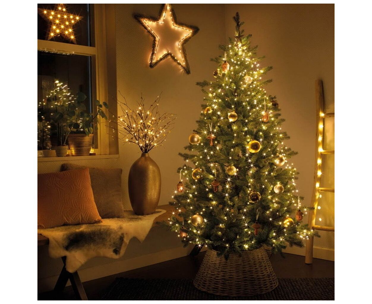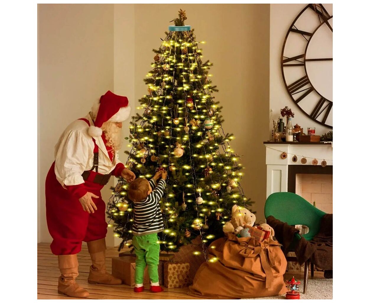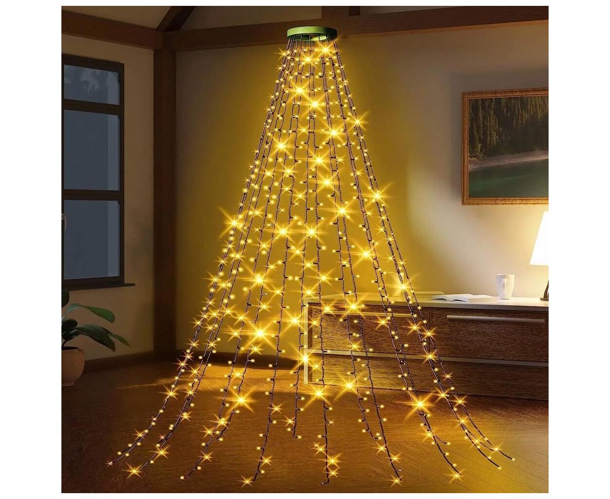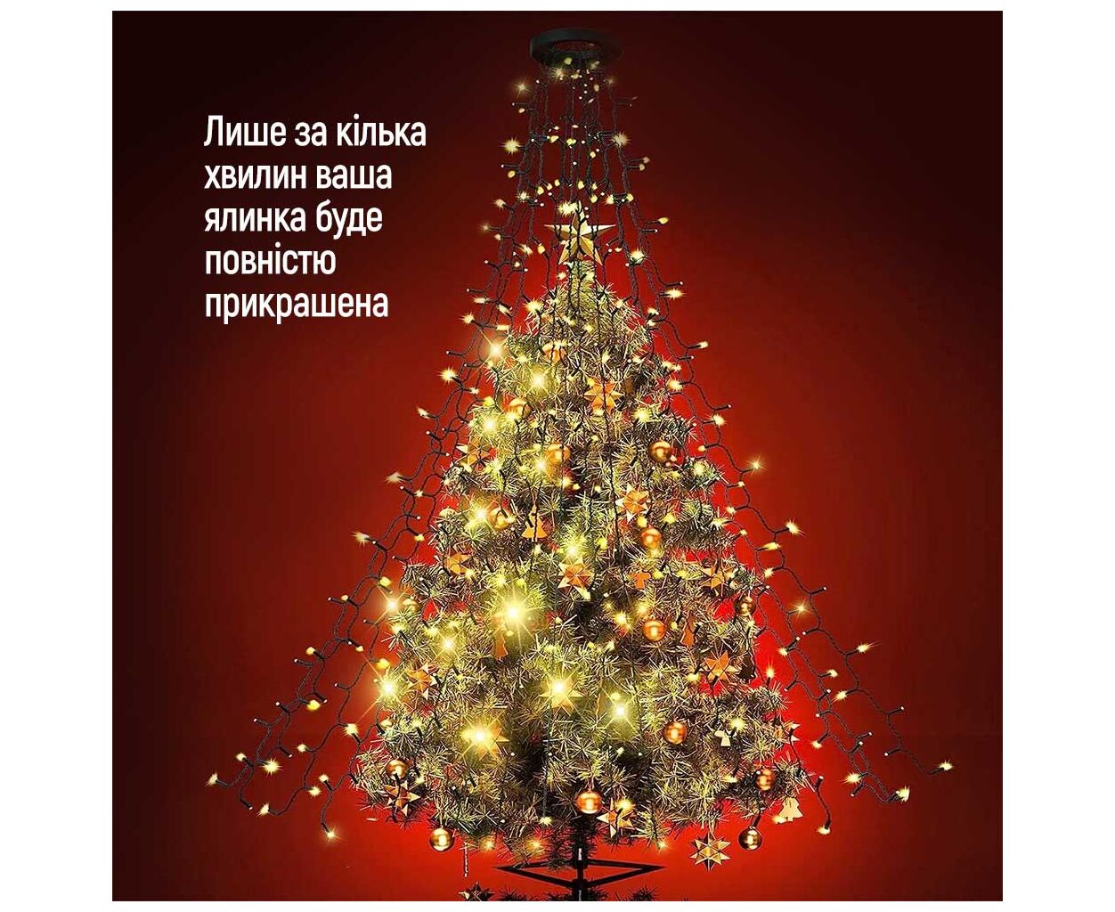 Оригінальна форма «конус» додає особливого шарму, а 7 вертикальних променів довжиною по 1.5 метра кожен створюють враження світлового водограю. Гірлянда складається з 98 LED-лампочок, які рівномірно розташовані уздовж довжини, наповнюючи атмосферу м'якими відтінками теплого жовтого світла. Це сприяє створенню невимушеної святкової атмосфери та затишку в будь-якому місці.