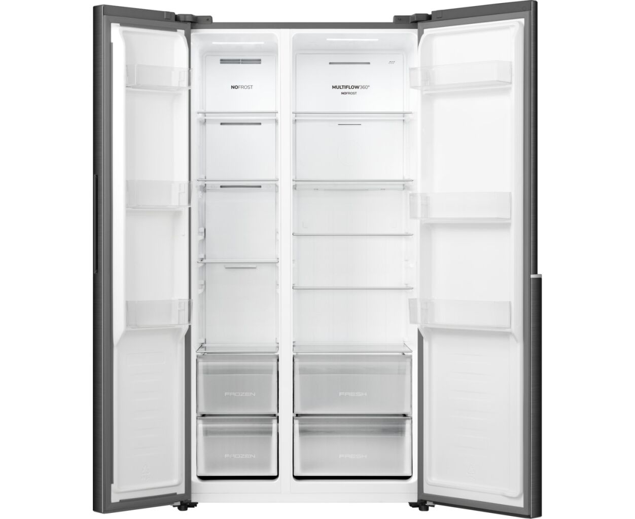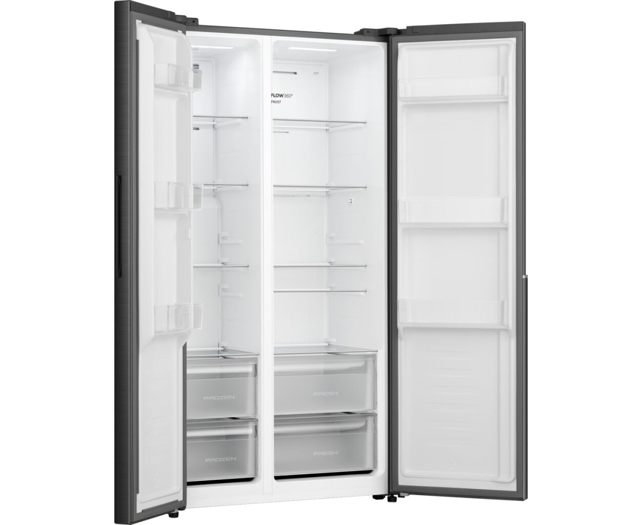 окремостоячий (соло), side-by-side, Загальний об'єм холодильника - 544 л, Система розморожування No Frost - холодильне + морозильне відділення, E, інверторний, Оснащення - форма для льоду, контейнер для овочів, лоток для яєць, Корисний об'єм холодильної камери - 347 л, Полиці холодильної камери - загартоване скло (3 шт.), Корисний об'єм морозильної камери - 197 л, Кількість секцій в морозильній камері - 6 шт, 39 дБ, 178.6 см, 91.1 см, 61.5 см, 80 кг, Колір - чорний, нержавіюча сталь