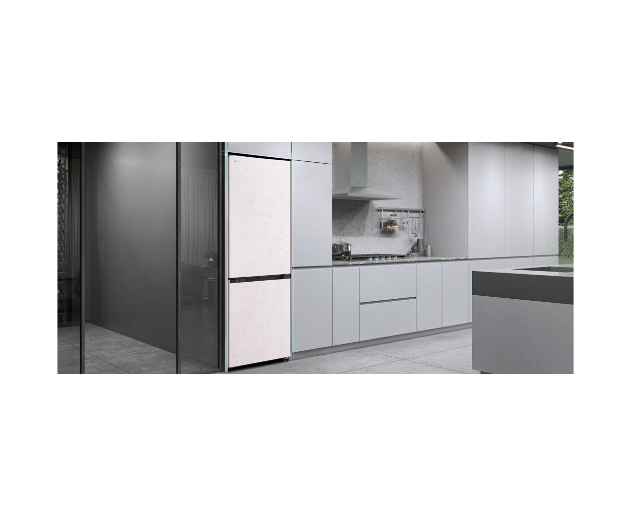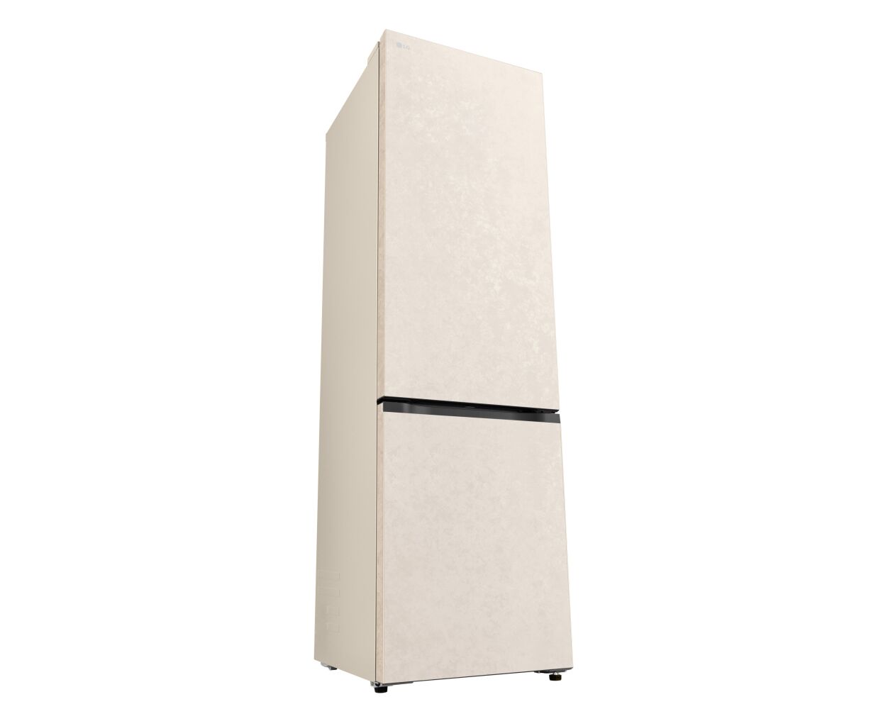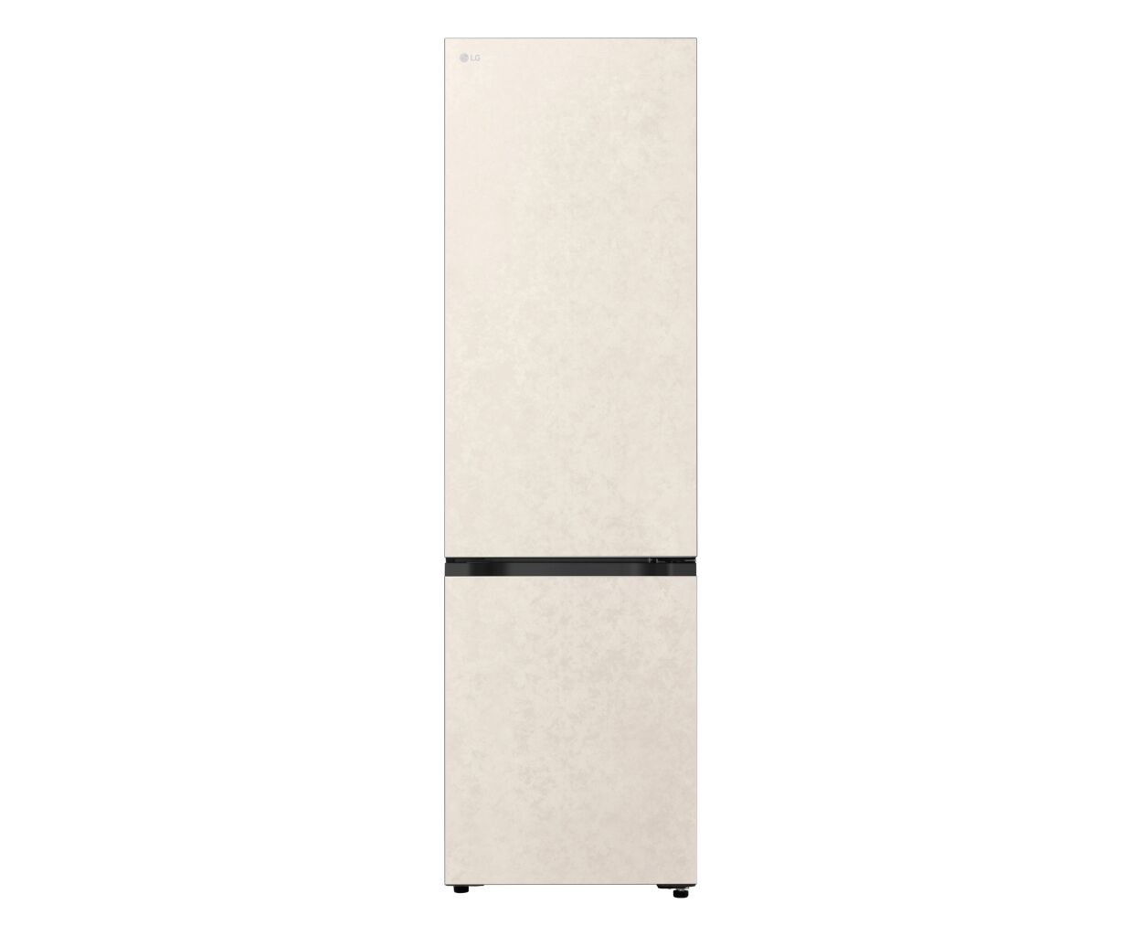 Холодильник LG GC-B509EESM з нижньою морозильною камерою має корисний об’єм 375 л (262 л холодильне + 113 л морозильне відділення) і належить до енергетичного класу E. Інверторний компресор забезпечує тиху роботу на рівні 35 дБ та потужність заморожування до 10 кг на добу. Система Total No Frost усуває потребу в розморожуванні, а Metal Fresh разом із зонами Fresh Converter та Fresh Balancer дозволяють підтримувати оптимальні умови для різних типів продуктів. Бежевий матовий колір корпусу та прихована горизонтальна ручка створюють м’який, нейтральний вигляд.