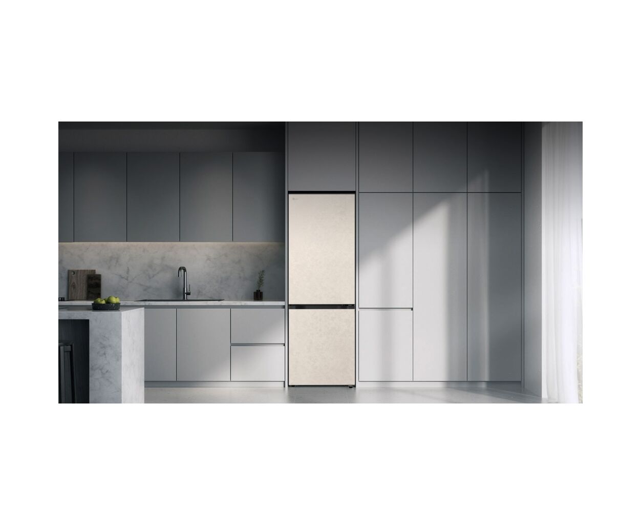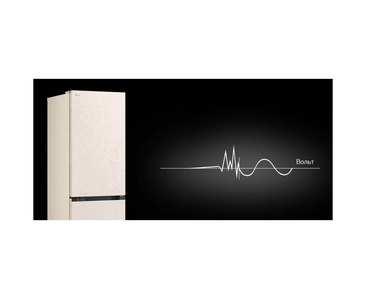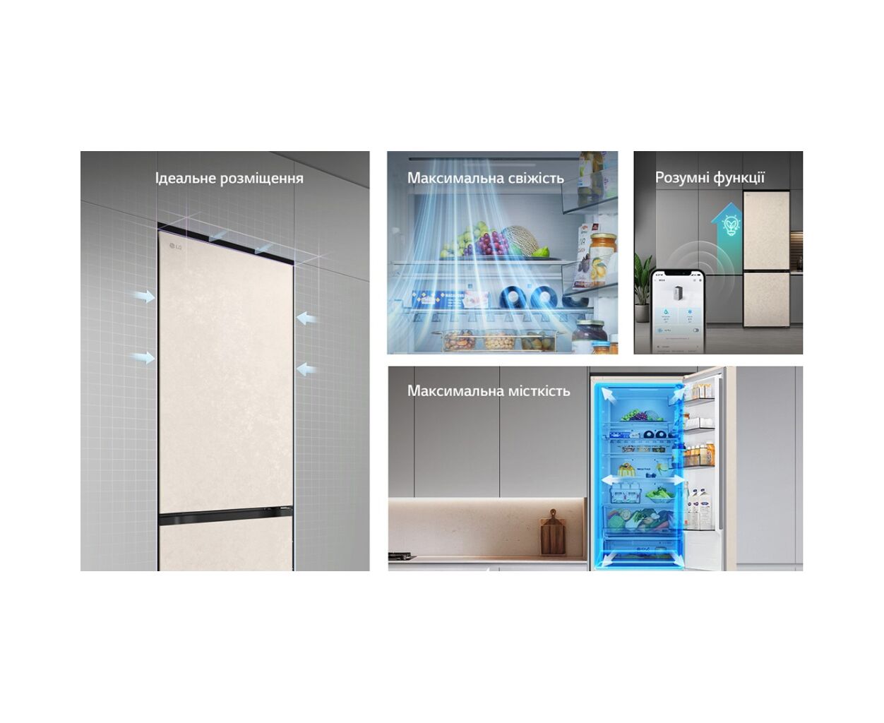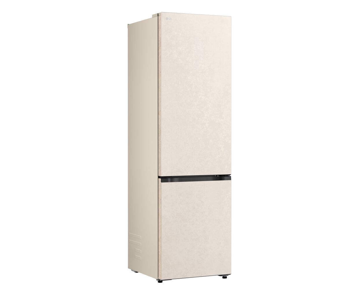 Холодильник LG GC-B509EESM з нижньою морозильною камерою має корисний об’єм 375 л (262 л холодильне + 113 л морозильне відділення) і належить до енергетичного класу E. Інверторний компресор забезпечує тиху роботу на рівні 35 дБ та потужність заморожування до 10 кг на добу. Система Total No Frost усуває потребу в розморожуванні, а Metal Fresh разом із зонами Fresh Converter та Fresh Balancer дозволяють підтримувати оптимальні умови для різних типів продуктів. Бежевий матовий колір корпусу та прихована горизонтальна ручка створюють м’який, нейтральний вигляд.