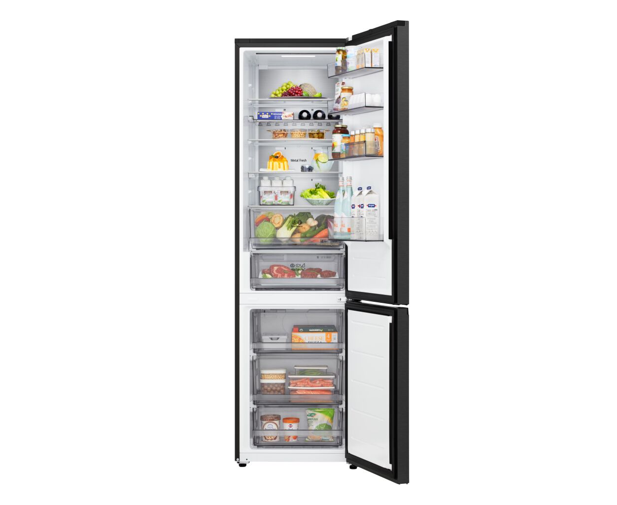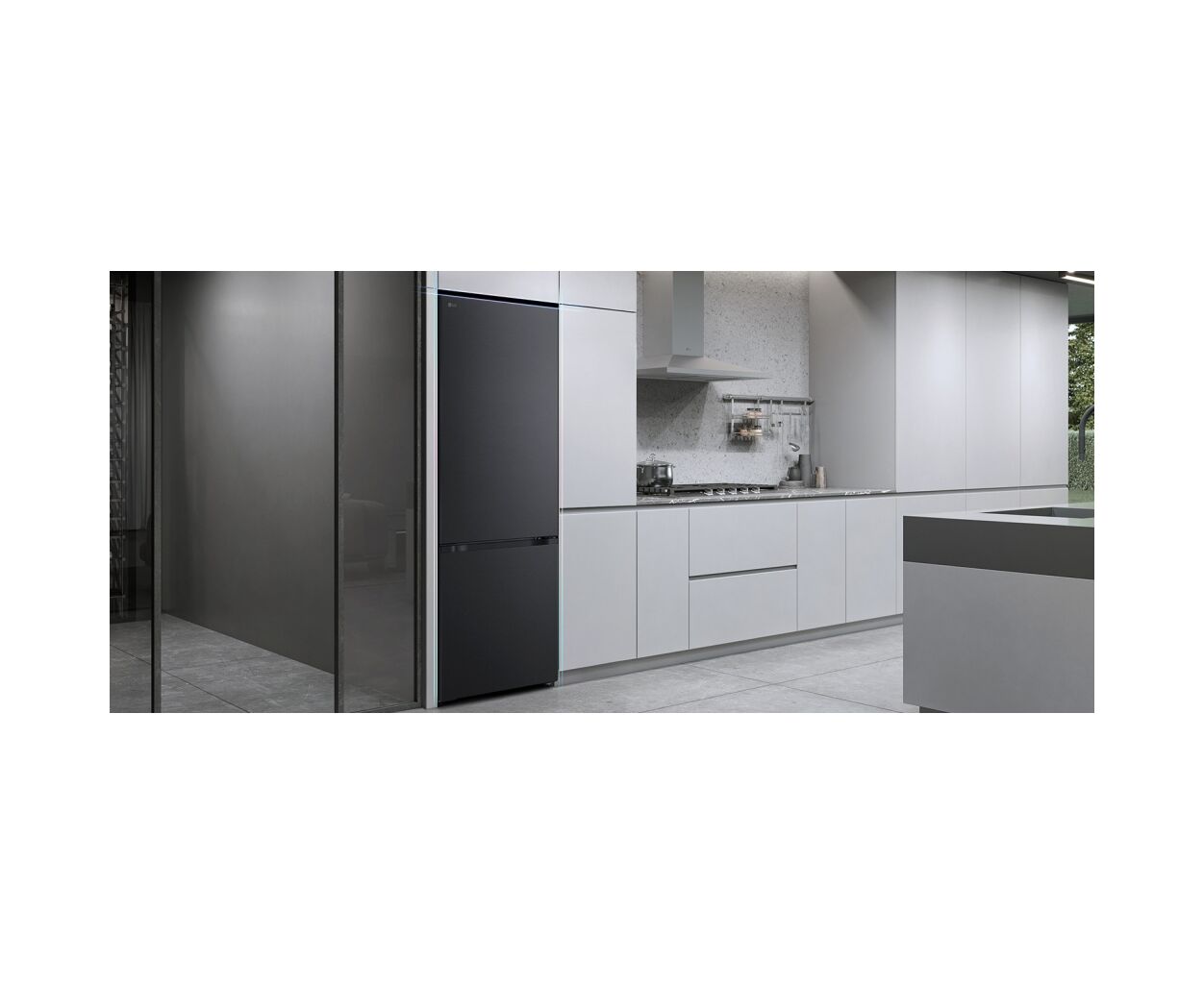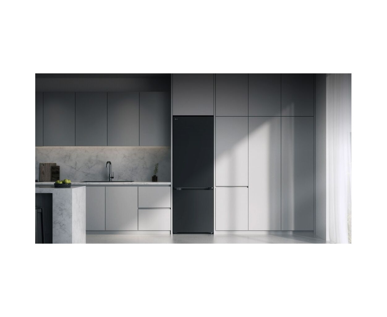 Холодильник LG GC-B509ETSM з нижньою морозильною камерою має корисний об’єм 375 л (262 л холодильне + 113 л морозильне відділення) і належить до енергетичного класу E. Інверторний компресор забезпечує рівень шуму 35 дБ та потужність заморожування 10 кг на добу. Система Total No Frost усуває необхідність розморожування, а Metal Fresh разом із зонами Fresh Converter та Fresh Balancer підтримують оптимальні умови для різних продуктів. Матове чорне покриття корпусу та прихована горизонтальна ручка створюють стриманий сучасний вигляд.