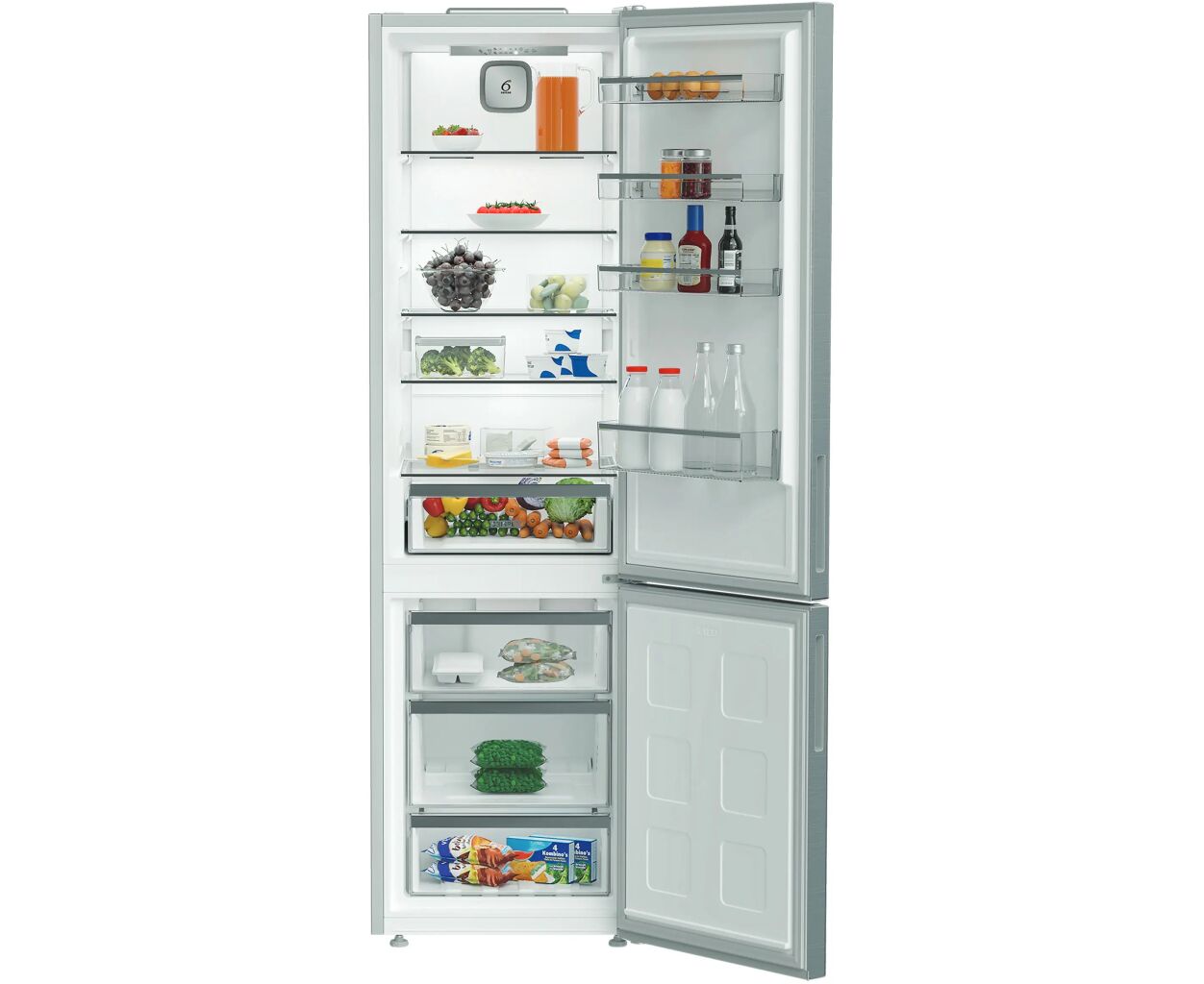 окремостоячий (соло), двокамерні, Загальний об'єм холодильника - 355 л, Система розморожування No Frost - холодильне + морозильне відділення, A++, інверторний, Оснащення - форма для льоду, контейнер для овочів, лоток для яєць, Корисний об'єм холодильної камери - 249 л, Полиці холодильної камери - 4 шт, Корисний об'єм морозильної камери - 106 л, Кількість секцій в морозильній камері - 3 шт, 35 дБ, 203.5 см, 59.5 см, 66.3 см, 76 кг, Колір - нержавіюча сталь