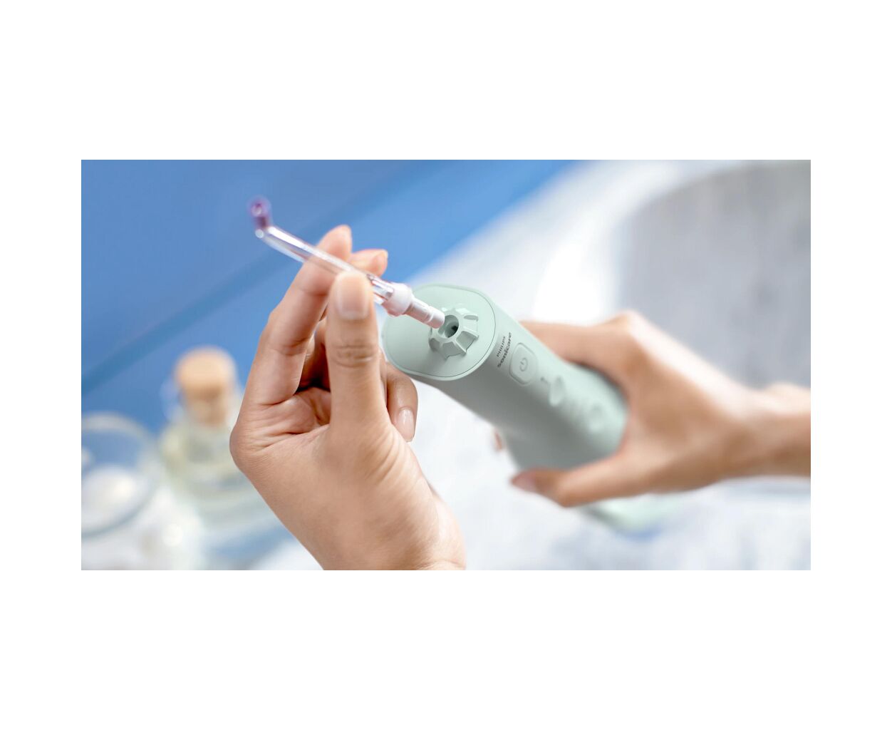 Для максимально ретельного чищення обирайте насадку F3 Quad Stream, яка, завдяки хрестоподібному потоку води у чотирьох напрямках, охоплює максимальну площу міжзубних проміжків та ясен.