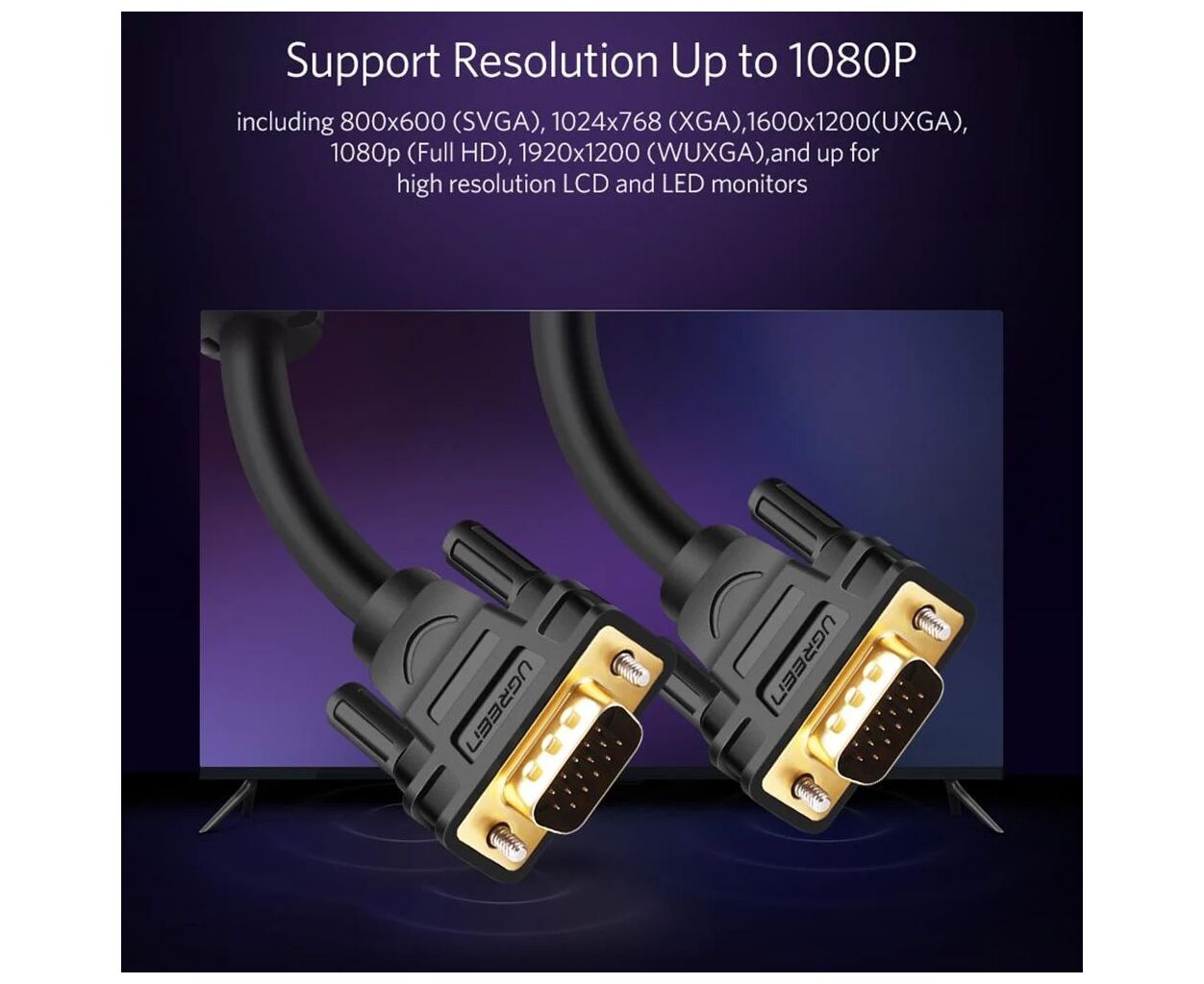 Кабель VGA-VGA підтримує роздільну здатність 800x600 (SVGA), 1024x768 (XGA), 1600x1200 (UXGA), 1080P (Full HD), 1920x1200 (WUXGA), призначений для РК-моніторів та світлодіодних моніторів.