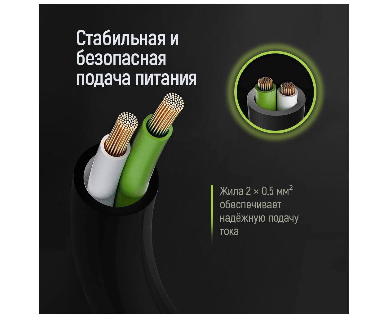 Кабель має міцну ПВХ-оболонку, що захищає його від механічних пошкоджень та зносу. Провідник із перетином 3 × 0.5 мм² гарантує безпечну та ефективну передачу струму. Доступний у довжинах 1 та 1.8 метра, що дозволяє обрати оптимальний варіант для різних сценаріїв підключення.