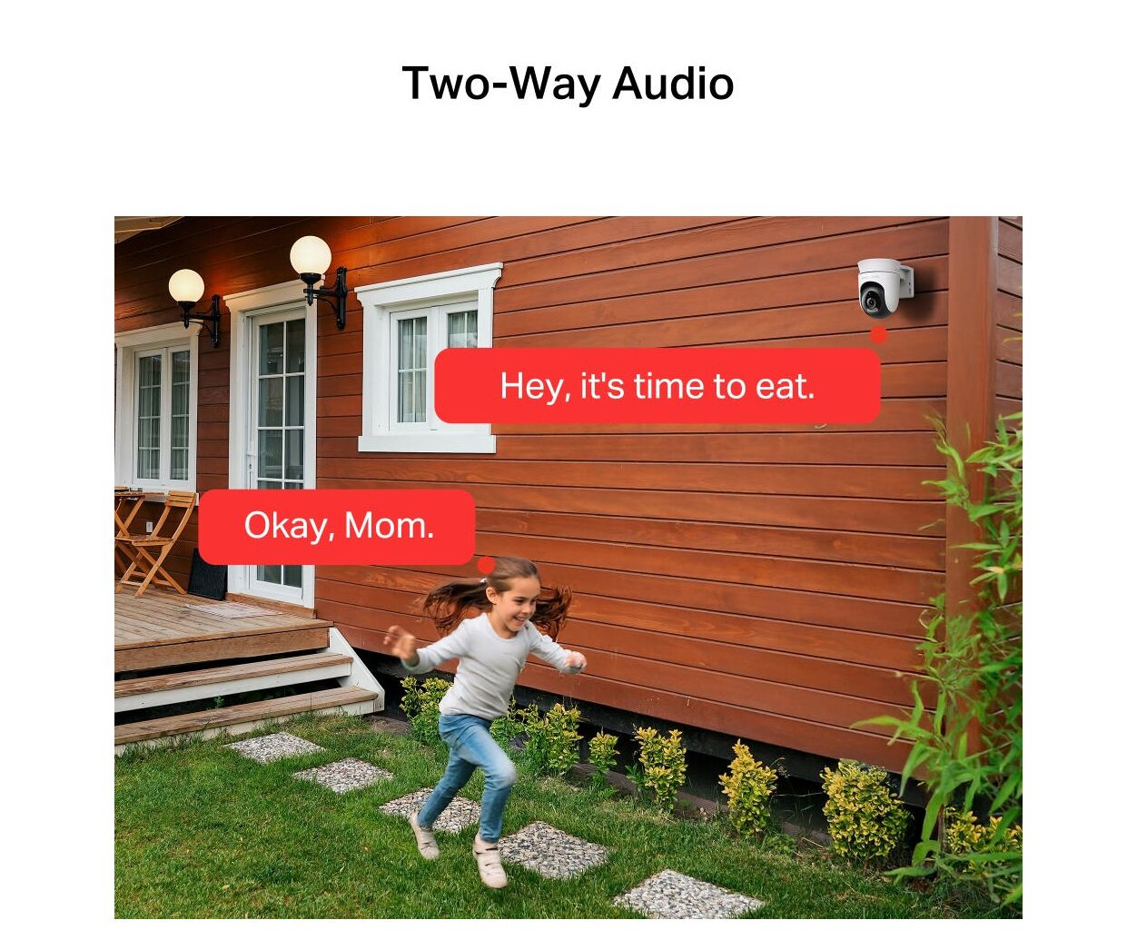 Вбудований мікрофон і динамік дозволяють чути і говорити через телефон — чи то вітаючи гостя, чи то розмовляючи з кур'єром, чи то заспокоюючи домашнього улюбленця. Говоріть через камеру в будь-який час.