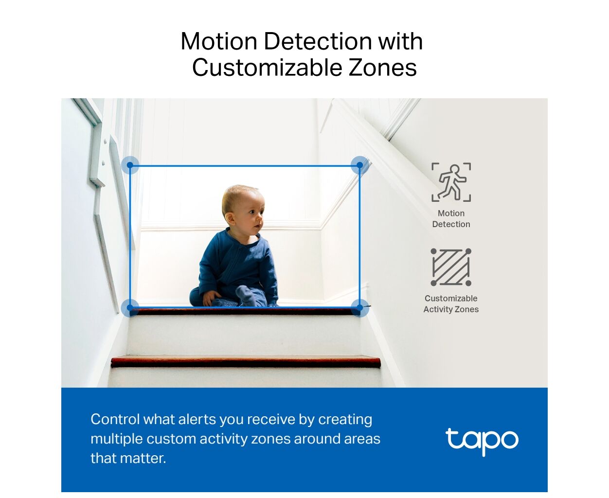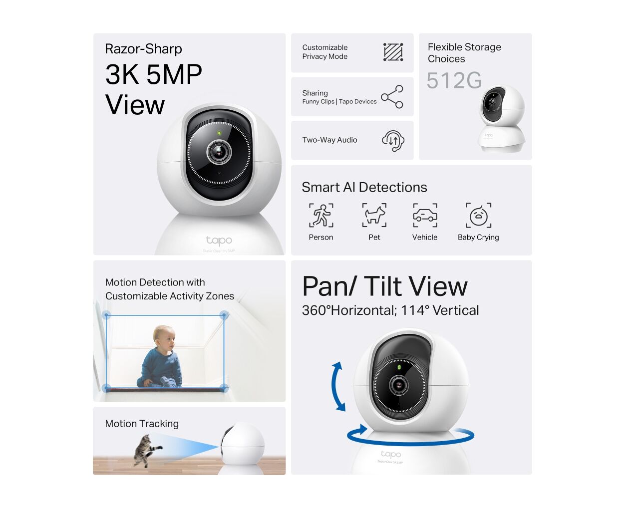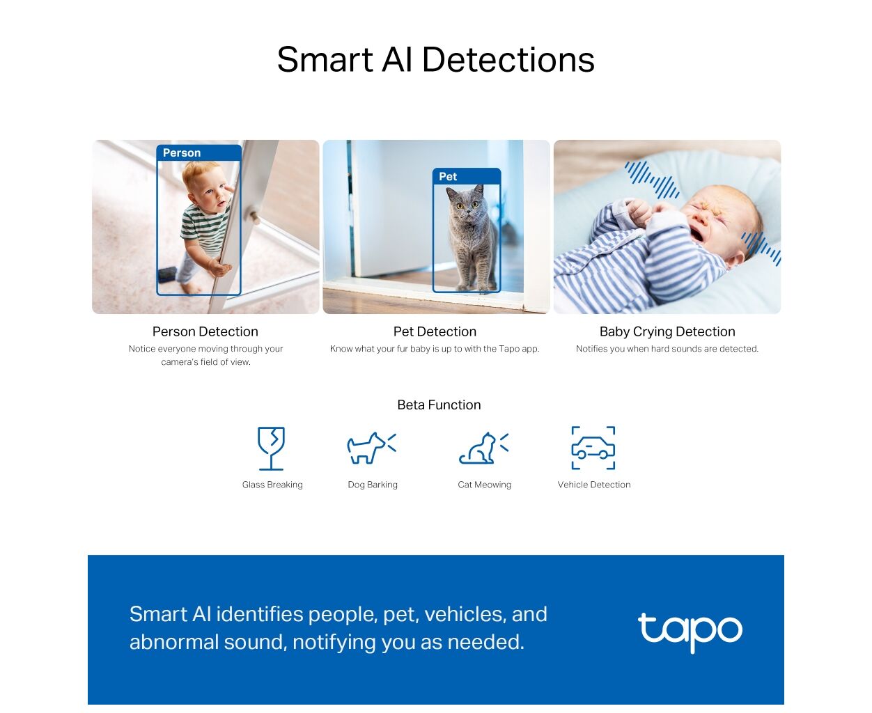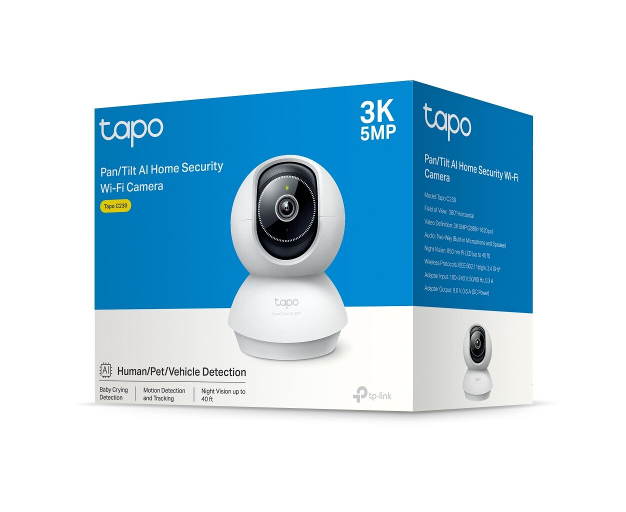 TP-Link TAPO-C230 оснащена інтелектуальними функціями розпізнавання за допомогою штучного інтелекту, що здатен ідентифікувати людей, тварин та транспорт, а також розпізнавати плач дитини та інші звуки, миттєво відправляючи повідомлення на ваш пристрій у разі необхідності.