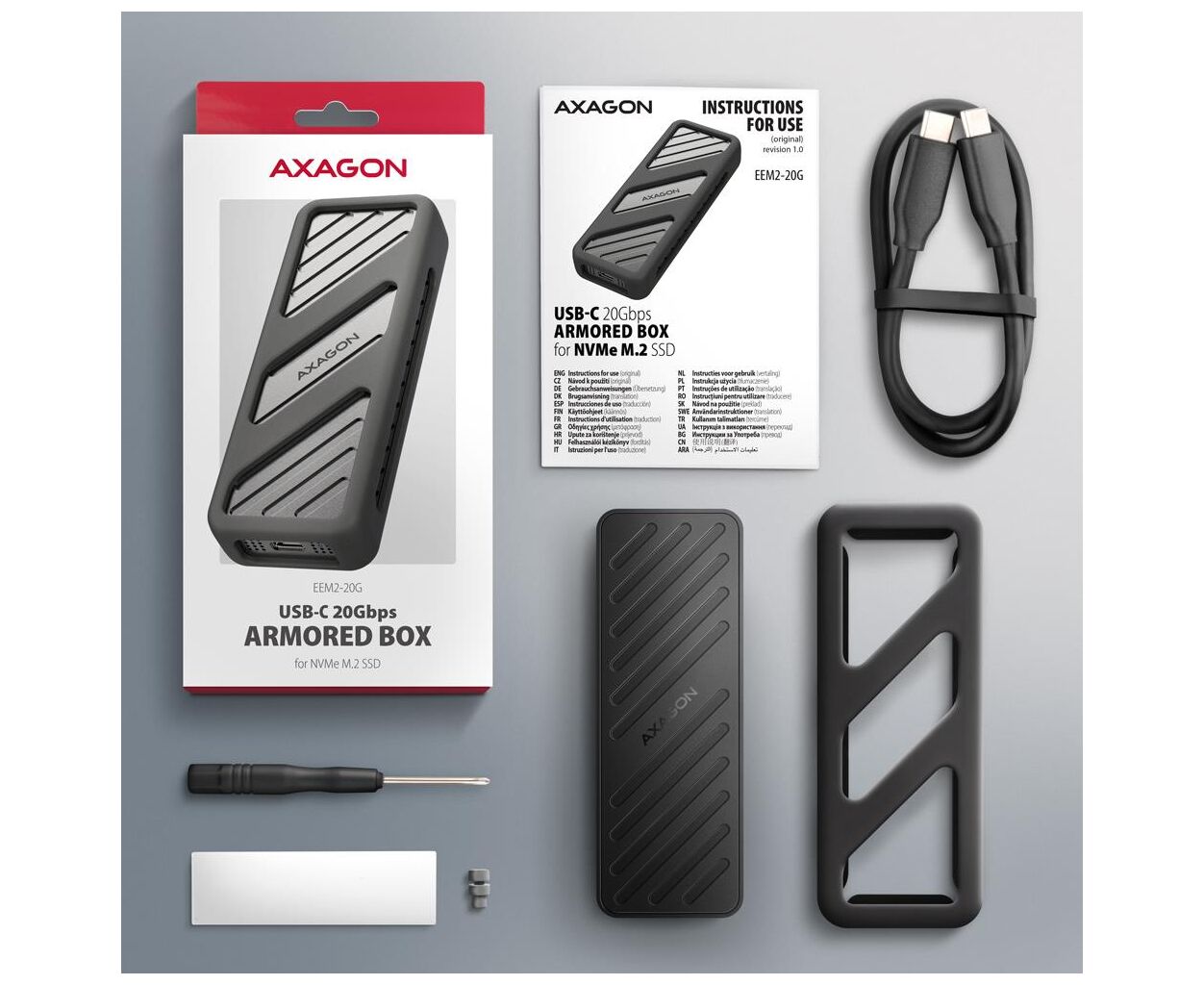 Характеристики Кишеня зовнішня AXAGON USB-C 20Gbps metal box for M.2 NVMe SSD ARMORED (EEM2-20G)