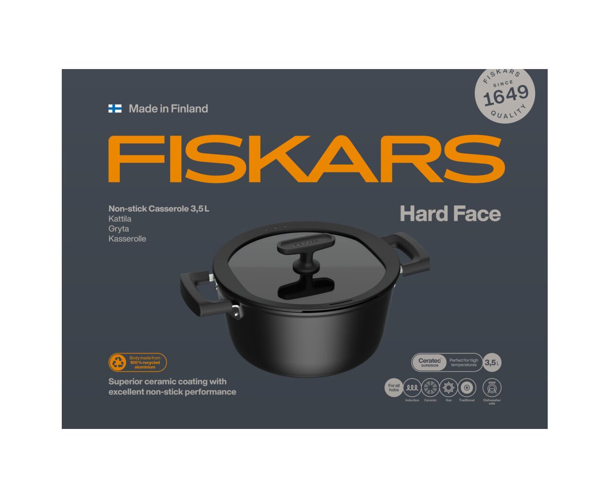 Каструля Fiskars серії Hard Face — скандинавська надійність та продуманий комфорт щодня, створено, щоб впевнено витримувати будь-які кулінарні випробування. Глибока конструкція каструлі у поєднанні з ергономічними кришками забезпечує зручне приготування супів, гарнірів і тушкованих страв зі збереженням смаку та користі, а сучасний дизайн і орієнтованість на здорове харчування роблять Hard Face універсальним вибором для щоденного використання.