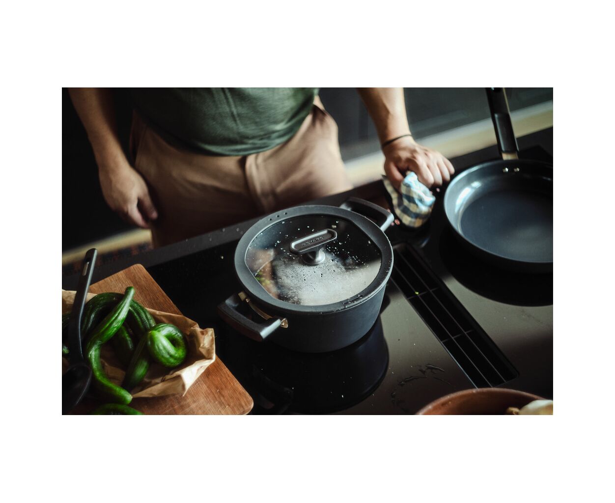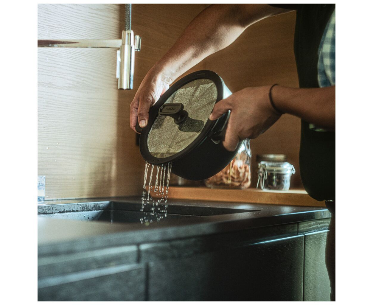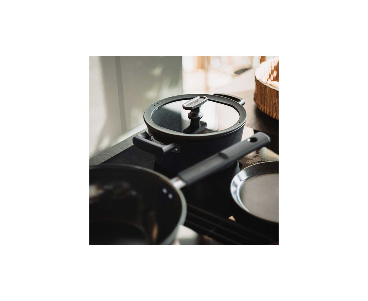 Комплект доповнено кришкою з м’яким силіконовим кантом для тихого використання та 2-ма функціональними зонами зливу рідини, а пласка форма займає мінімум місця, економлячи простір на кухні.