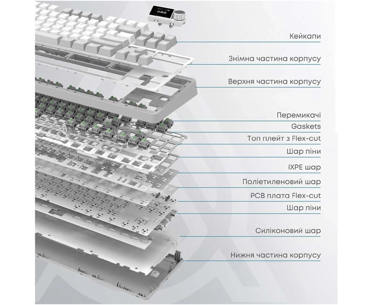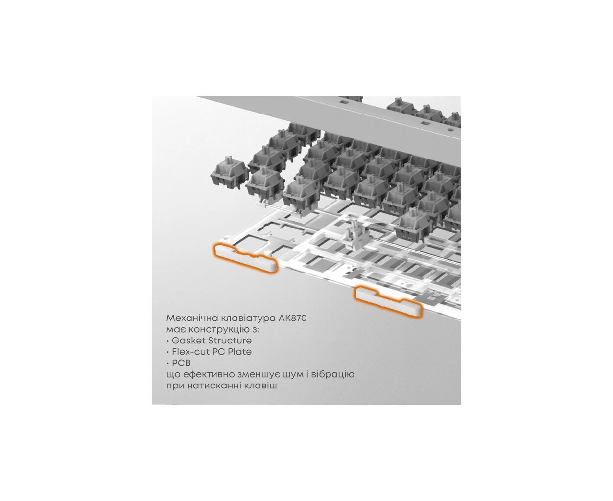 - Гаскетна структура для зменшення шуму та підвищення комфорту під час набору