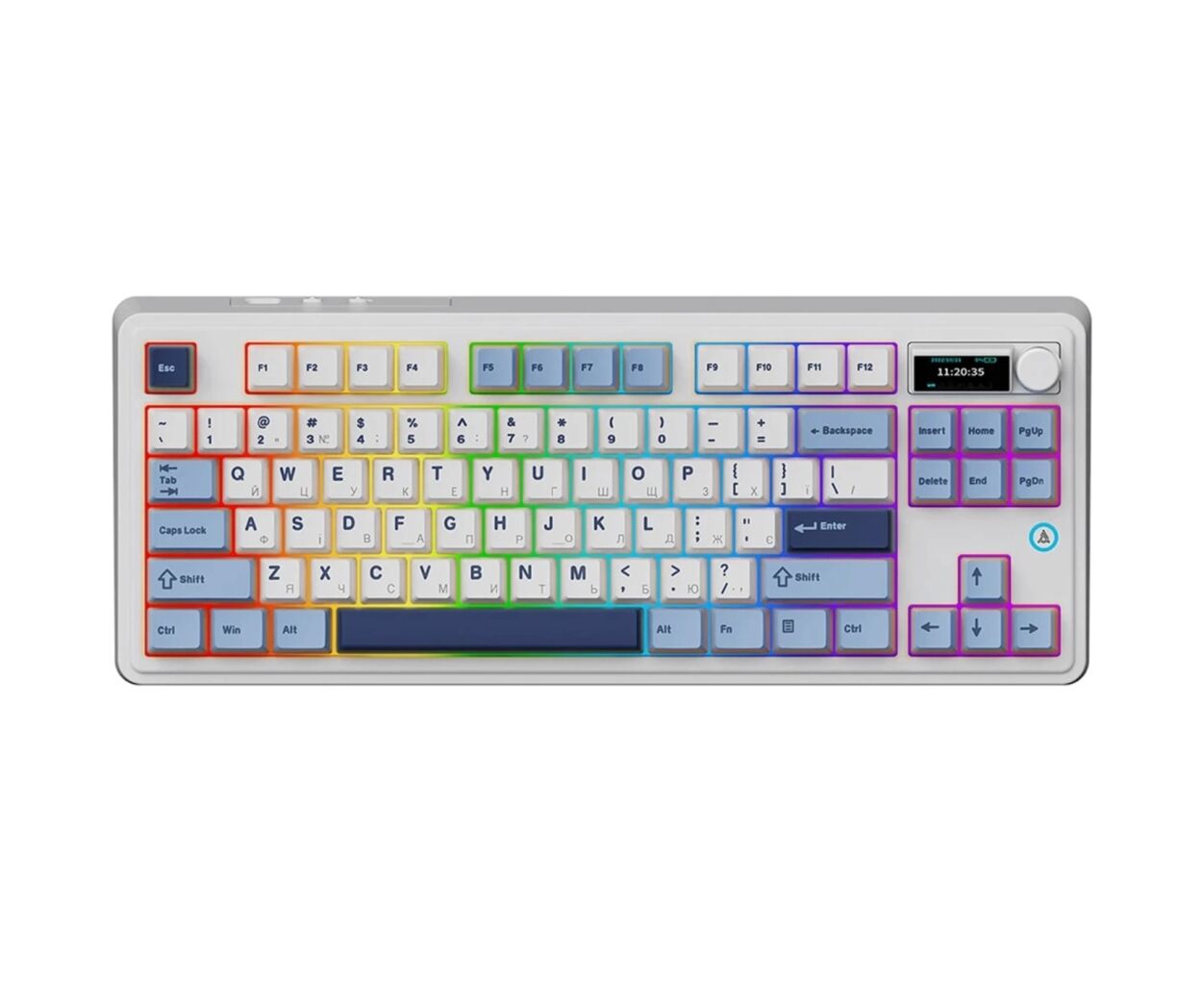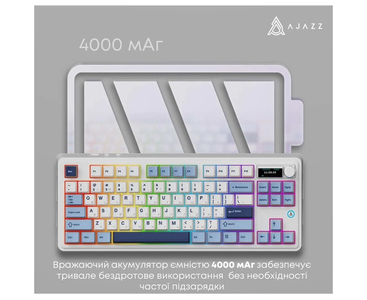 Ajazz AK870 PLUS – механічна бездротова клавіатура формату 87%, яка поєднує стильний дизайн, комфортні Murad Switches та зручний кольоровий TFT-дисплей. Клавіатура підтримує три режими підключення – дротове USB-C, Bluetooth 5.0 та 2.4 ГГц – що робить її універсальною для роботи, навчання та ігор.