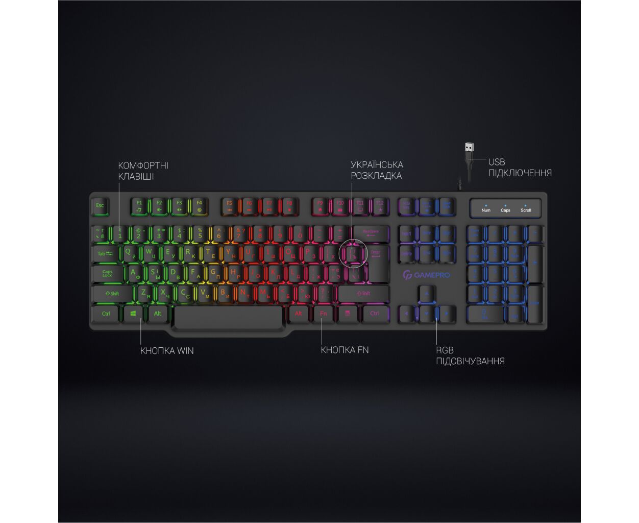 Ця дротова клавіатура підключається через USB-інтерфейс, що гарантує стабільність зв'язку. Компактний та повнорозмірний формат робить її ідеальним вибором для будь-якого користувача, який хоче отримати повну функціональність без компромісів. Один з ключових атрибутів GamePro GK380 – барвисте RGB підсвічування клавіш, яке не тільки додає естетичної насолоди, але й підкреслює ваш унікальний геймерський стиль. Вибір кольорів та режимів підсвічування дозволяє налаштувати клавіатуру під ваш настрій і атмосферу у кімнаті.