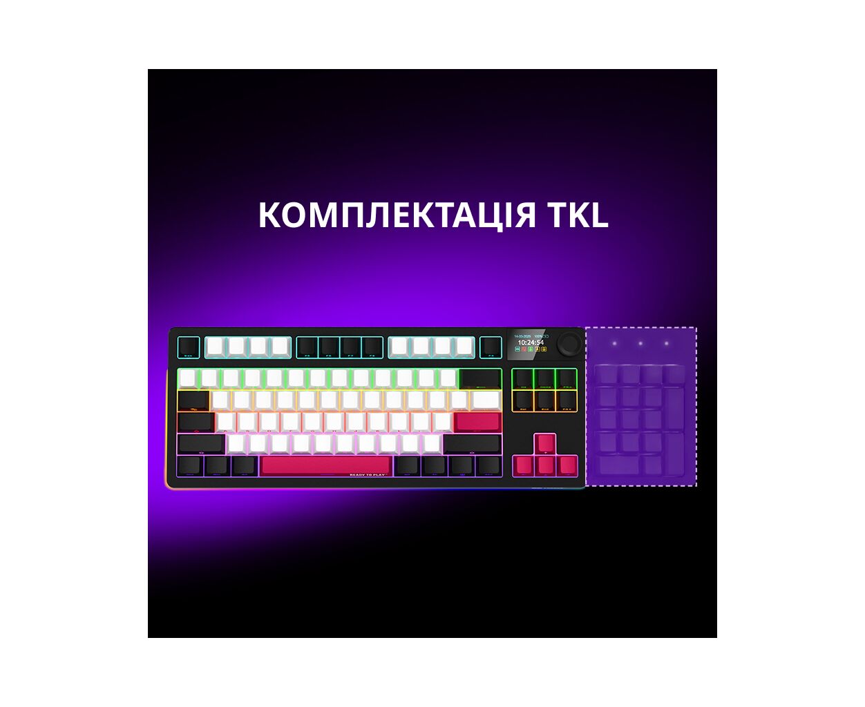 ігрова, мультимедійна, з підсвіткою, для телевізора, механічна, дротова, бездротова, USB, Bluetooth, компактна, Підсвічування - RGB, англійська, українська, Перемикачі (Switches) - Lorgar Toxic Purple, Клавіш - 85, з дисплеєм, змінні клавіші, програмовані клавіші, регулювання підсвітки, регульовані ніжки, з регулюванням гучності, Шнур - 2.3 м, 370 x 142 x 45 мм, 1005 г