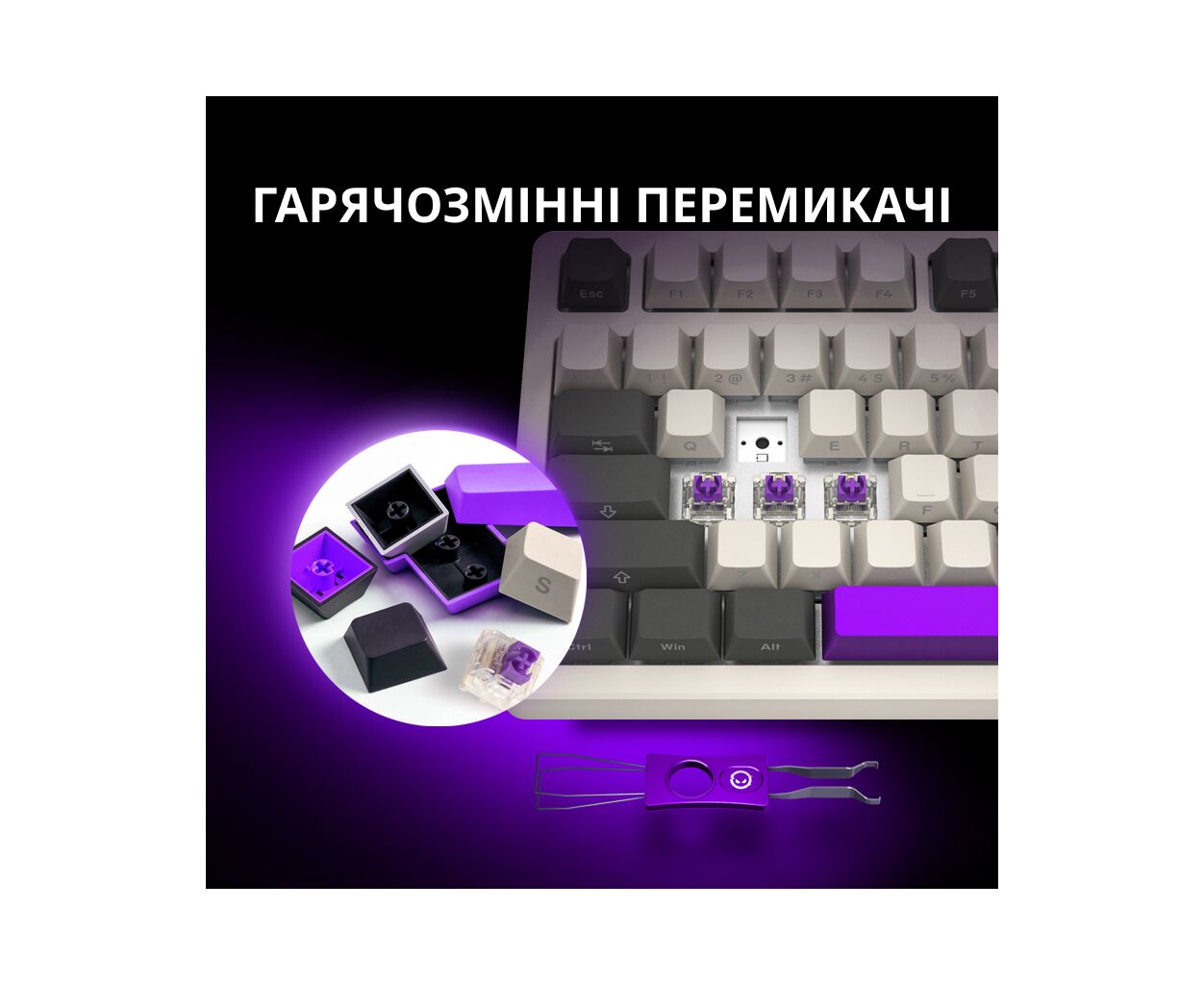 Клавіатура Lorgar KBP70TKLW Wireless TKL Mechanical Pro UA White (LRG-KBP70TKLW-WH-US) - це більш ніж просто клавіатура; це справжній інструмент для геймерів і професіоналів, які цінують високу якість, надійність та стиль в кожному натисканні. Завдяки механічній конструкції, клавіатура оснащена лінійними перемикачами Lorgar Toxic Purple, які забезпечують надзвичайно плавне та тихе введення, розраховане на 50 мільйонів натискань. Спеціальний гаскетний монтаж дозволяє клавішам мати м’який хід, знижуючи рівень шуму до мінімуму.