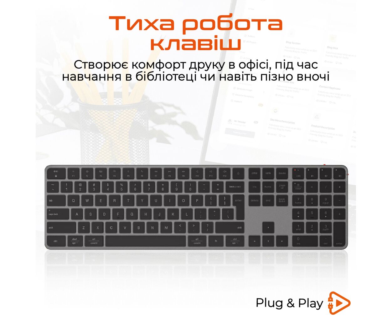 Потужний акумулятор на 300 мА*год дозволяє використовувати клавіатуру до 150 годин на одному заряді, що робить її надійним партнером для тривалих робочих сеансів чи подорожей. Швидке заряджання всього за 2-3 години через USB Type-C гарантує, що пристрій завжди готовий до роботи.