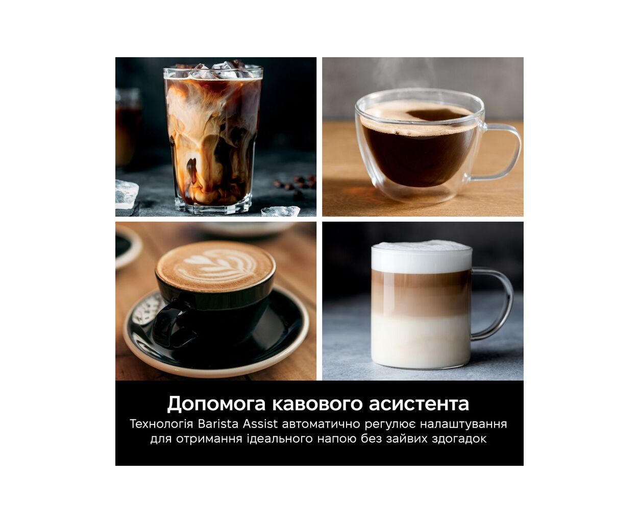 Система Barista Assist допоможе вам надати експертні рекомендації на основі ваших смаків. Подрібнювач навіть розпізнає, який кошик ви використовуєте, і автоматично регулює налаштування, тож вам не потрібно. Результат: ідеально збалансована кава.