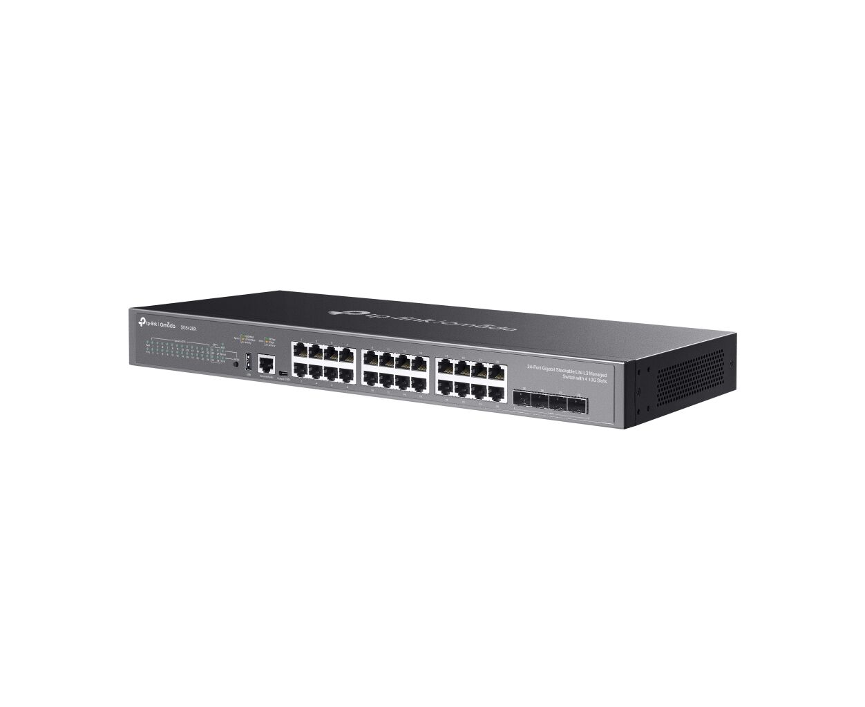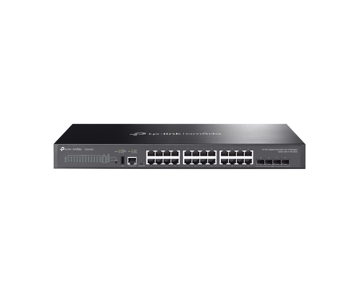 керований, Портів - 28, USB 2.0, 24 x 10/100/1000 Мбіт/с RJ45, 4 x SFP+, 1 консольний порт USB Type-C, Комутаційна здатність - 128 Гбіт/с, Робота - від -5 до +45°С, Зберігання - від -40 до 70 °C