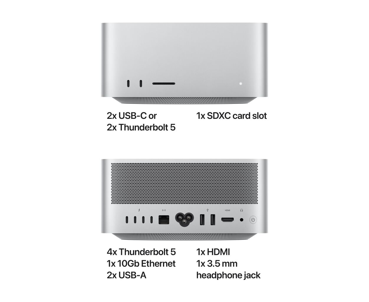 Створіть студію своєї мрії. Mac Studio оснащено портами Thunderbolt 5 зі швидкістю передавання даних до 120 Гбіт/с — це втричі швидше, ніж у Thunderbolt 4. Він також підтримує стандарти Wi‑ Fi 6E та Bluetooth 5.3.16 Керуйте зовнішніми дисплеями, завантажуйте дані безпосередньо з SDXC‑карт, підключайте високошвидкісні периферійні пристрої або використовуйте зовнішній корпус для розширення інтерфейсу PCIe, щоб створити ідеальний творчий майданчик.