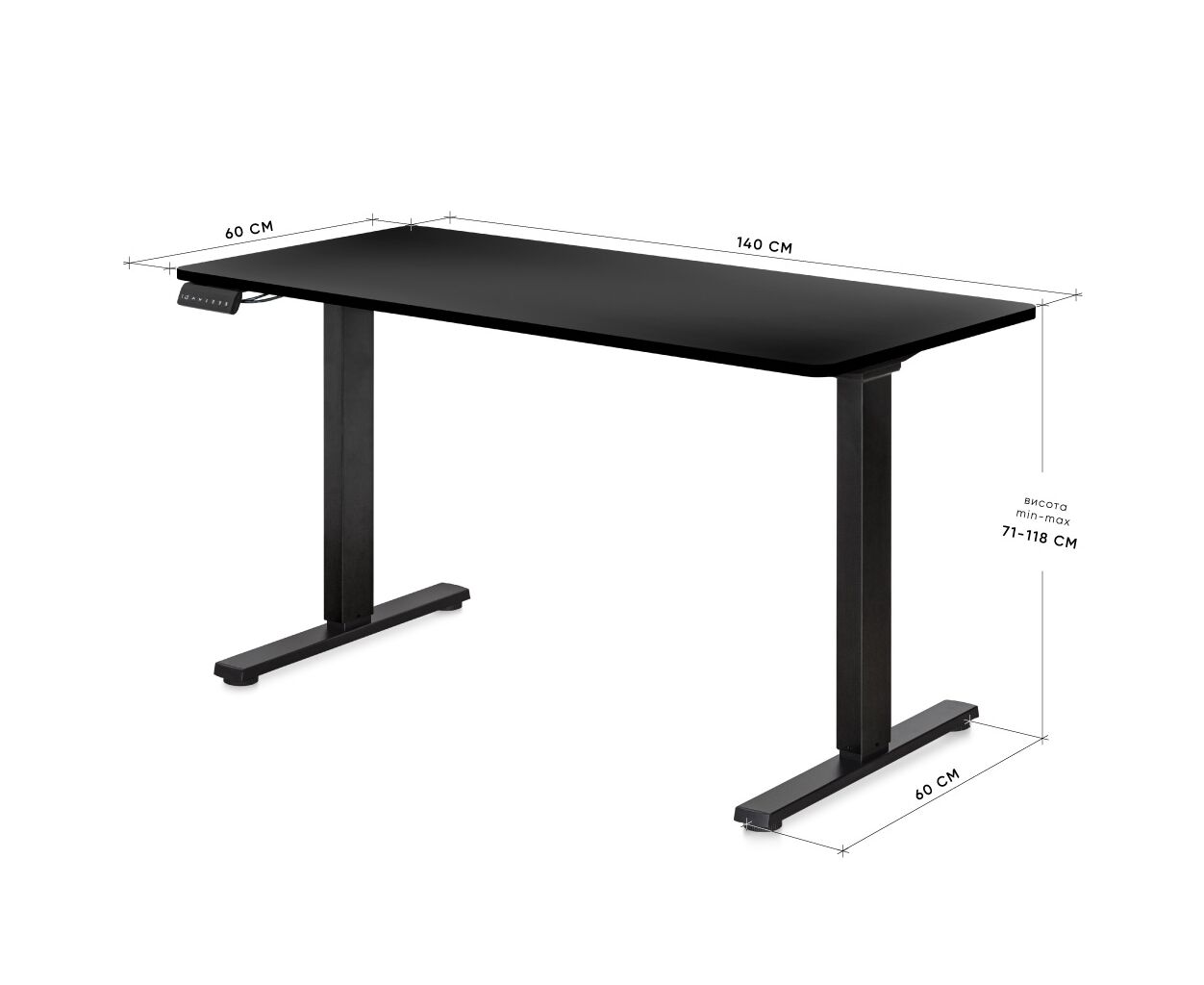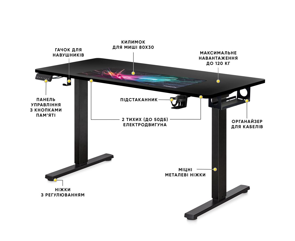 Тип - геймерський, для роботи стоячи, Матеріал - метал, ламіноване дсп, Ширина - 140 см, Глибина - 60 см, Колір - чорний, Вага - 31 кг