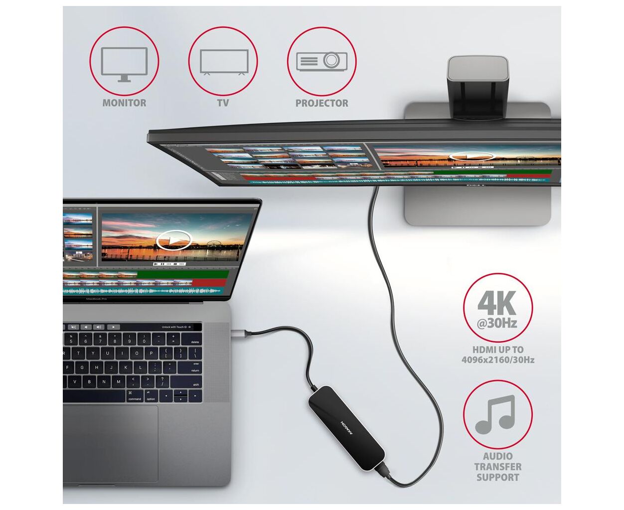 Тип - зовнішній, Інтерфейс підключення - USB Type-C, Вихідні роз'єми - 4 x USB 3.0, 1 x HDMI, 1 x USB Type C, 4K@30Hz, 1920x1080@60Hz