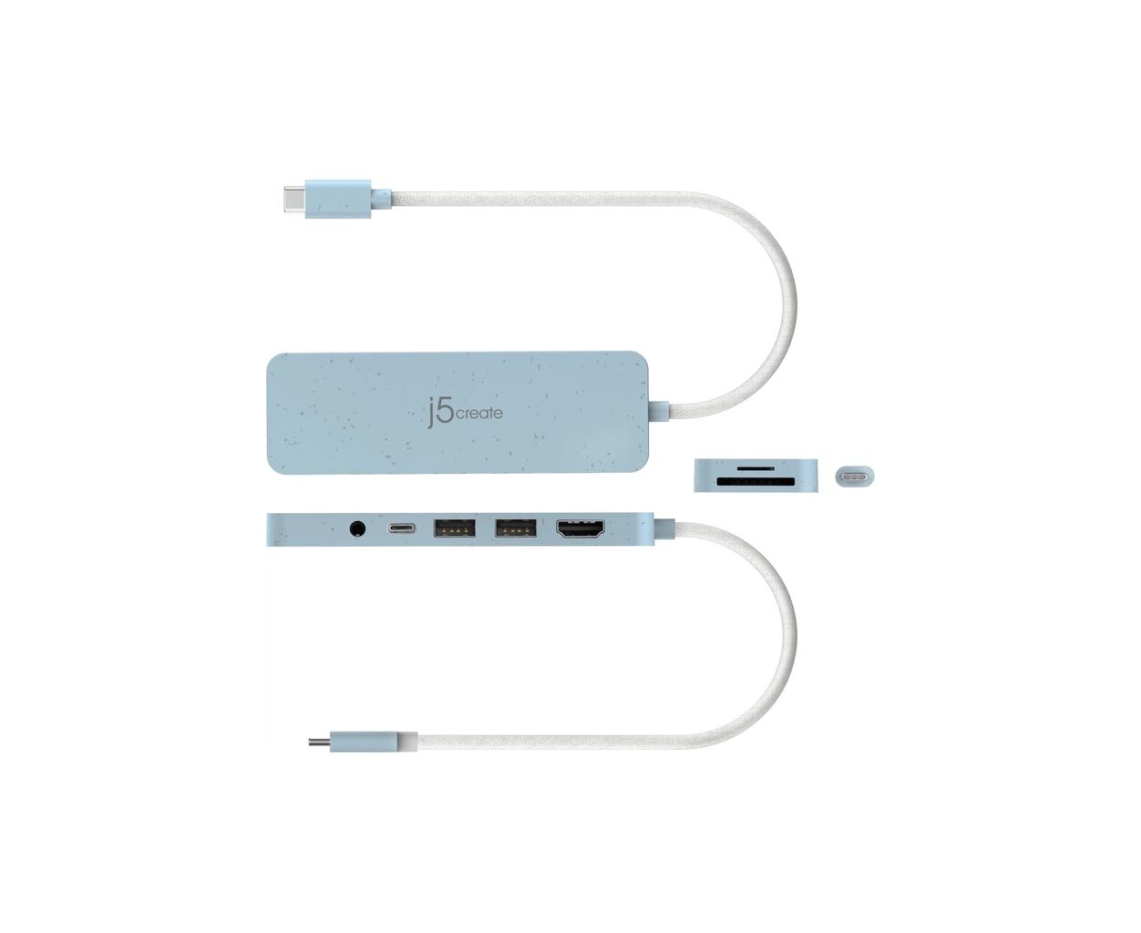 Концентратор J5create USB-C 6-in-1 2xUSB 3.2 + USB-C PD + HDMI 4K + SD/TF + 3.5mm cyan (JCD373EC-N)