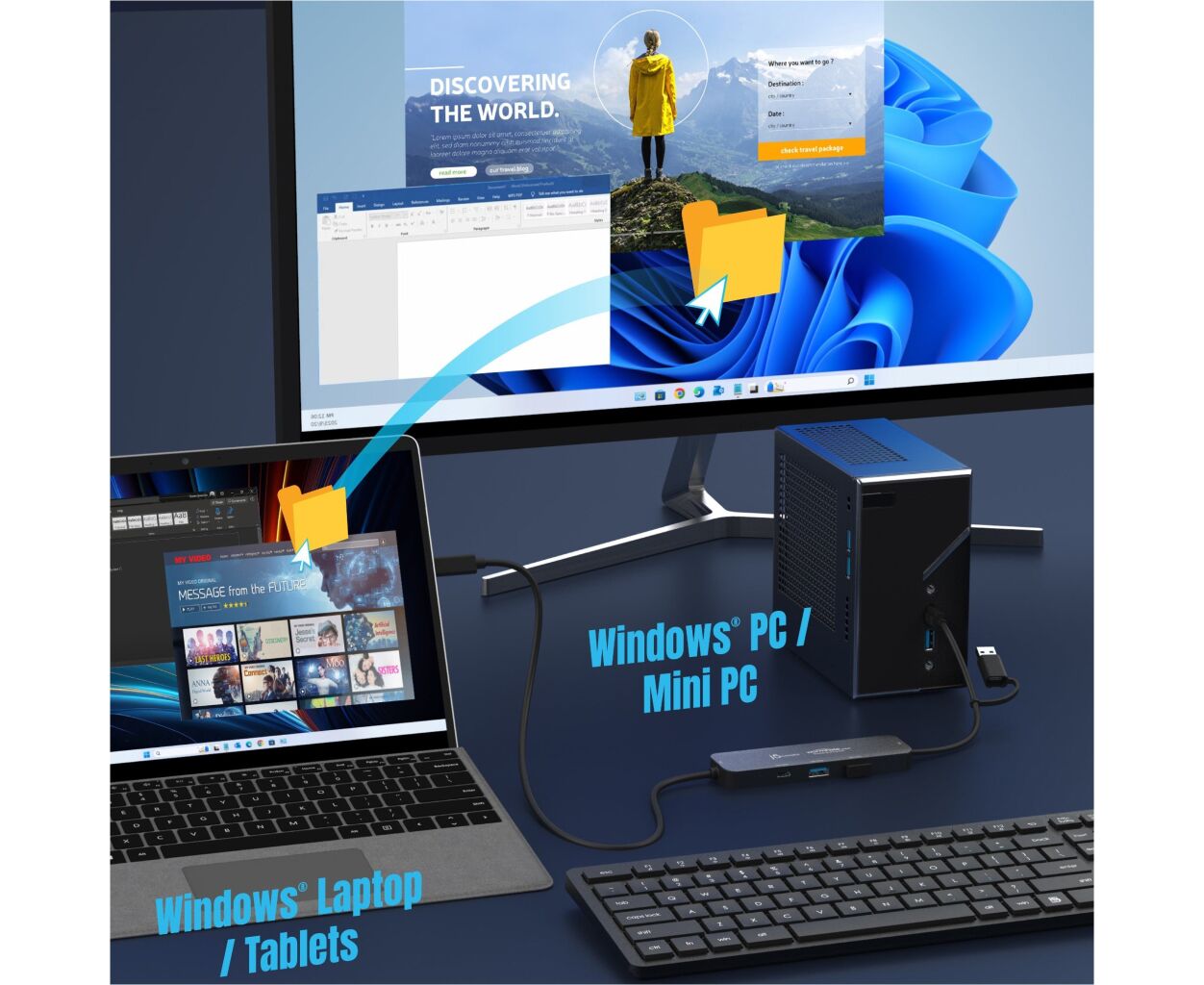 Концентратор для спільного використання дисплея Wormhole Switch — це ідеальний помічник для тих, хто працює на двох комп'ютерах під управлінням Windows. Завдяки вбудованій функції KM (клавіатура та миша) ви можете легко керувати обома пристроями за допомогою клавіатури або миші, що значно спрощує переключення між завданнями. Безперешкодно обмінюйтеся файлами за допомогою перетягування або копіювання та вставлення, спрощуючи передачу даних — від документів до мультимедійних файлів.