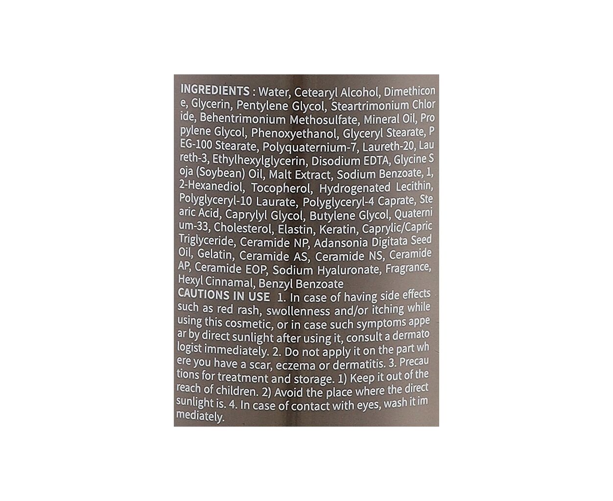- Water, Cetearyl Alcohol, Dimethicone, Glycerin, Pentylene Glycol, Steartrimonium Chloride, Behentrimonium Methosulfate, Mineral Oil, Propylene Glycol, Phenoxyethanol, Glyceryl Stearate, PEG-100 Stearate, Polyquaternium-7, Laureth-20, Laureth-3, Ethylhexyl