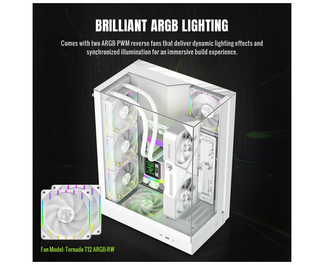 - Включає два вентилятори ARGB PWM для динамічних, синхронізованих світлових ефектів.