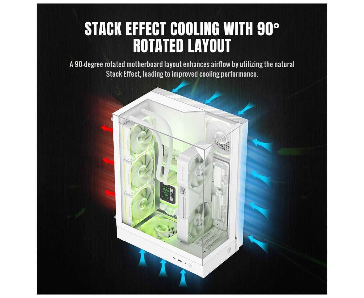 - Повернуте на 90° компонування материнської плати покращує потік повітря завдяки природному ефекту стеку.