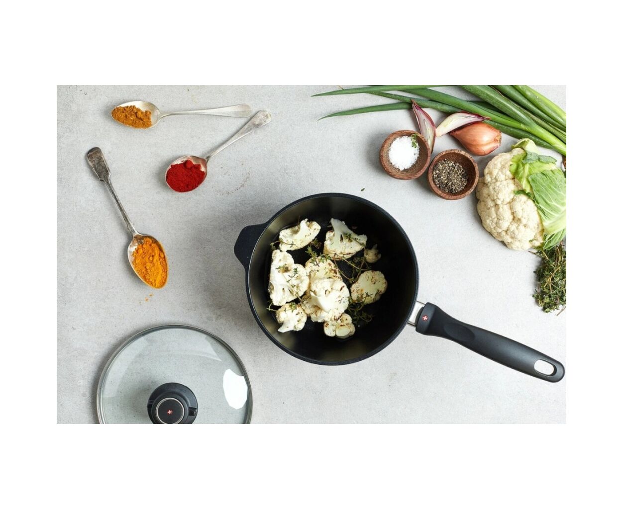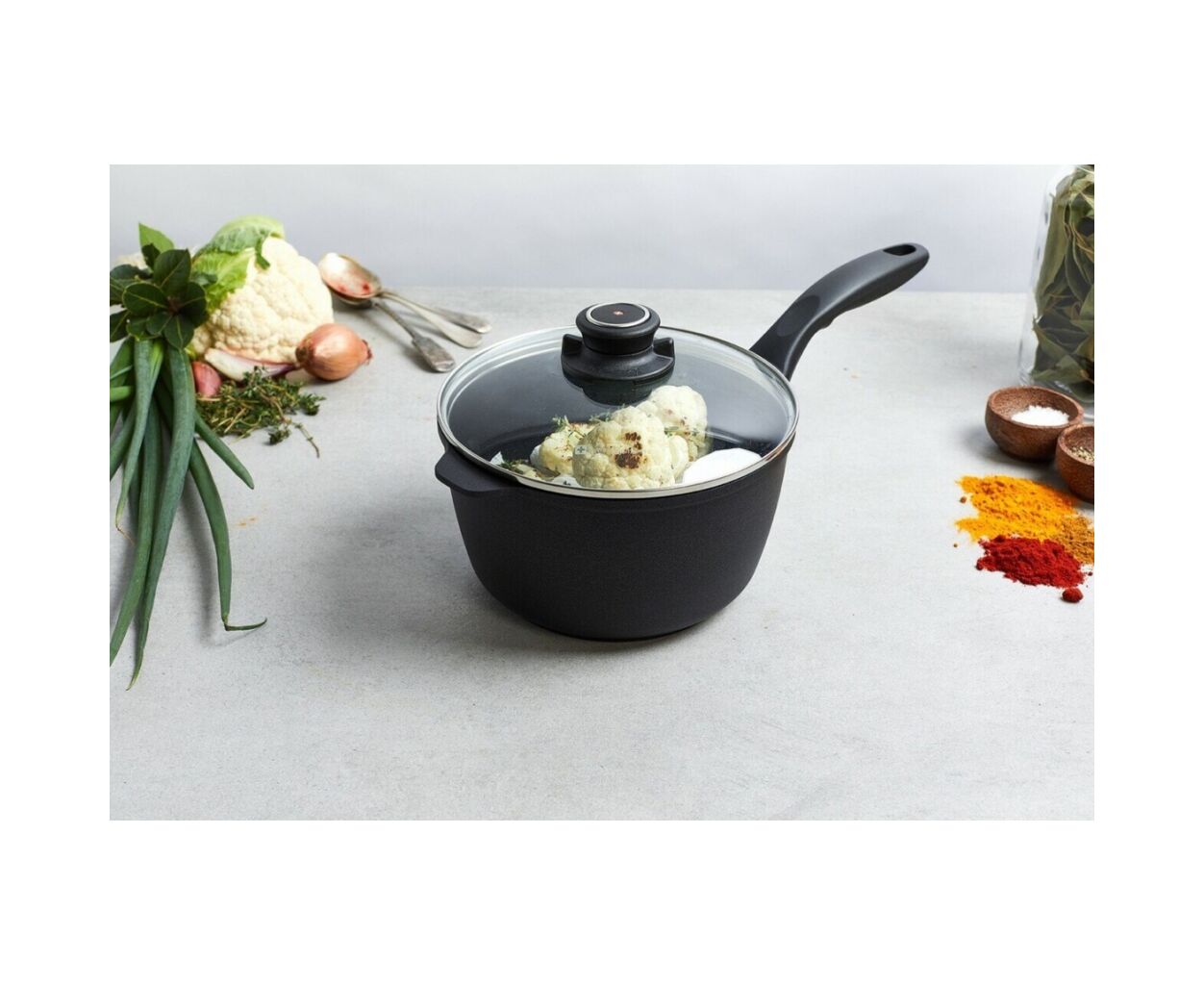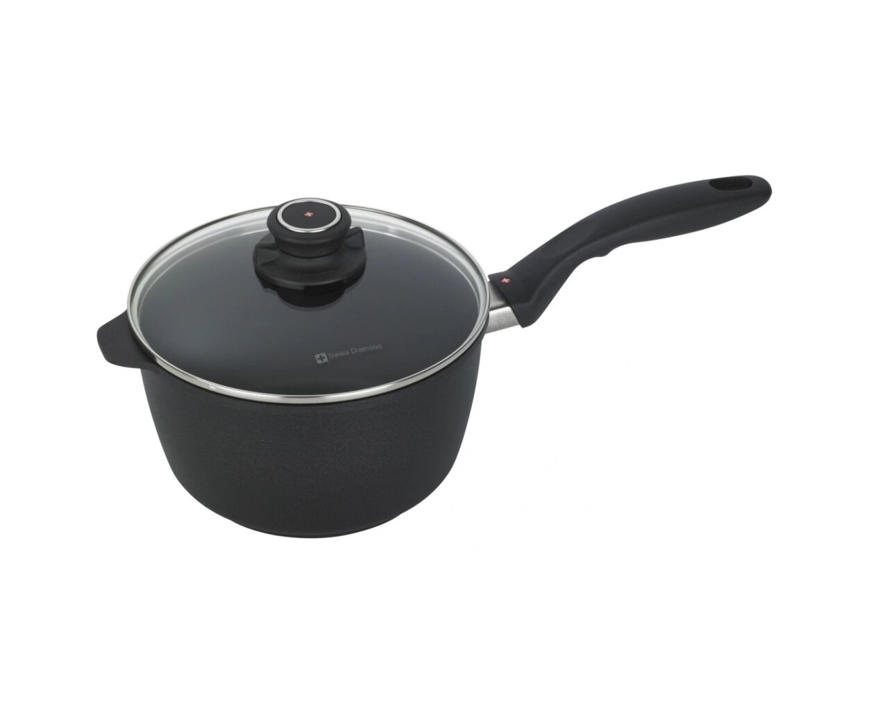 Це посуд преміум класу, виготовлений із високоякісного литого алюмінію. Ергономічні ручки з термостійкого бакеліту, розроблені з урахуванням необхідної противаги, дозволяють використовувати ківш у духовці за температури до 260 °С. Кришка із загартованого скла оснащена характерним для посуду Swiss Diamond регульованим отвором для пари.