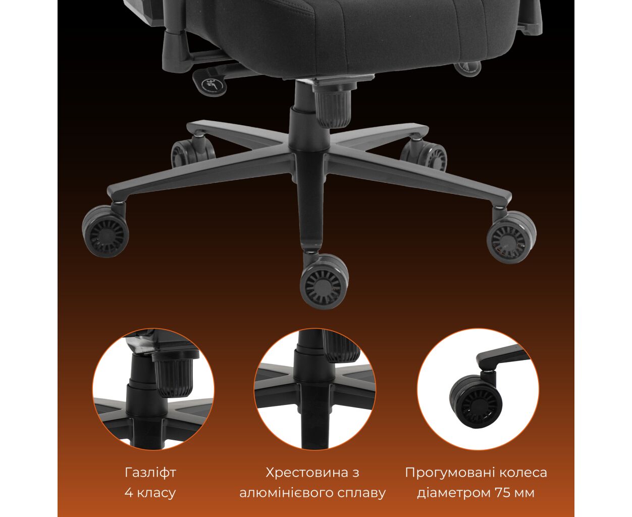 Важливим доповненням є значні прогумовані ролики діаметром 65 мм, що гарантують легкий рух без ризику пошкодження підлогового покриття, при цьому вони плавно й безшумно ковзають по будь-якій поверхні. Газліфт 4 класу, з можливістю регулювання від 45.5 до 53 см, забезпечує плавність регулювання висоти сидіння під зріст користувача до 195 см.