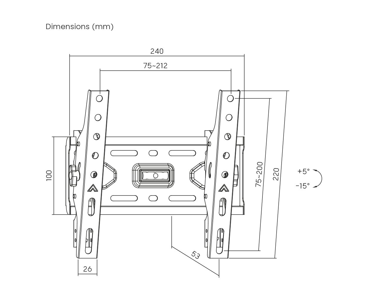 Цей похилий тип кронштейна забезпечує кут нахилу від +5° до -15°, що дозволяє з легкістю налаштувати кут огляду, забезпечуючи максимальний комфорт перегляду у будь-який момент. Компактні розміри з відстанню від стіни всього 53 мм роблять цю модель непомітною, але функціональною частиною кімнати, не забираючи надміру простору.