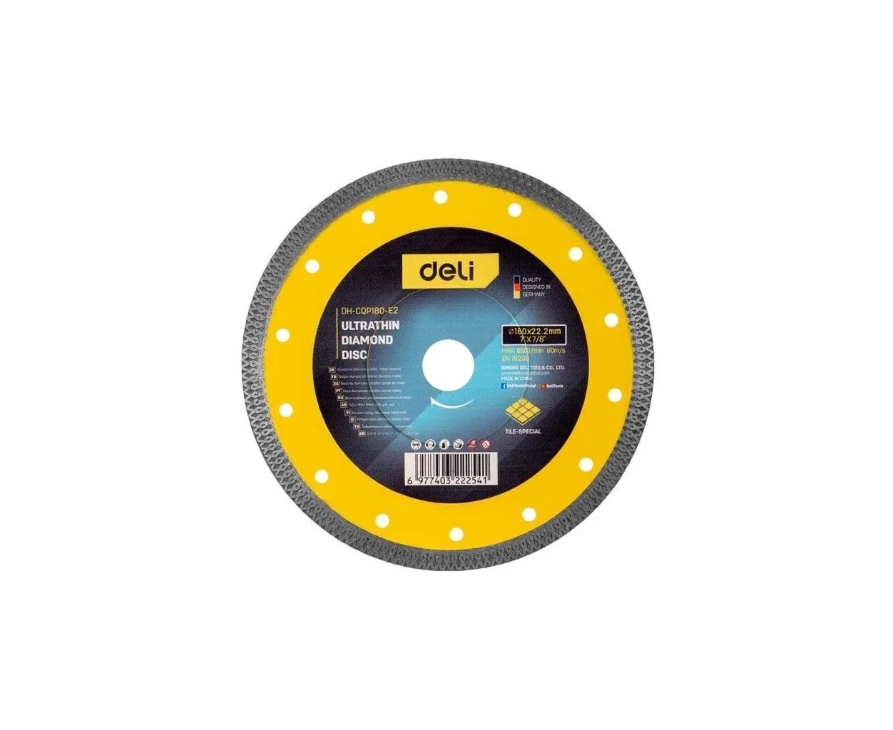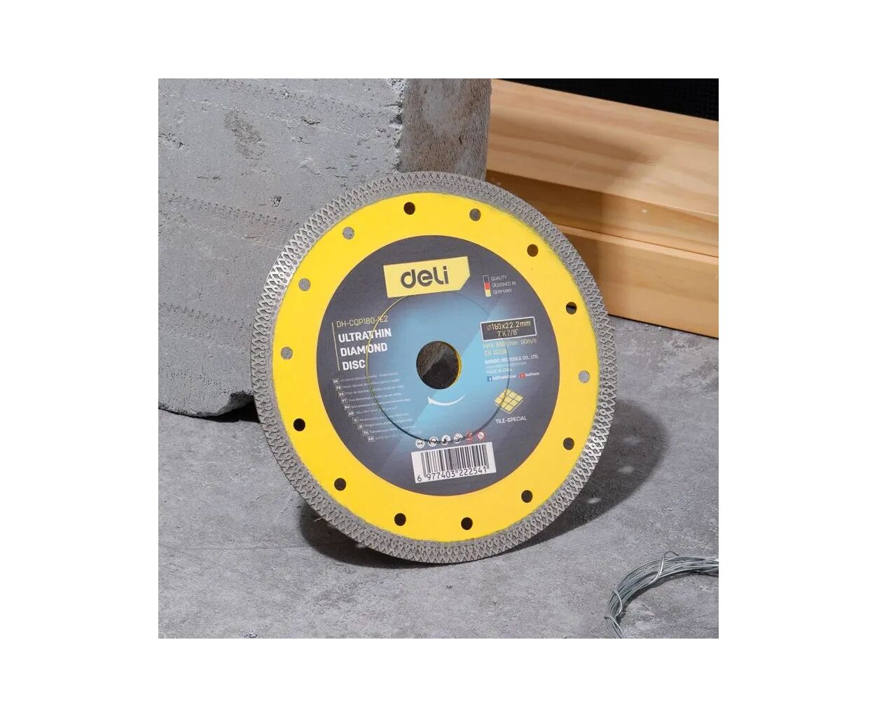 Опис Круг відрізний Deli тонкий алмазний, по плитці, бетону, каменю 180 x 22,2 мм (EDH-CQP180-E2)