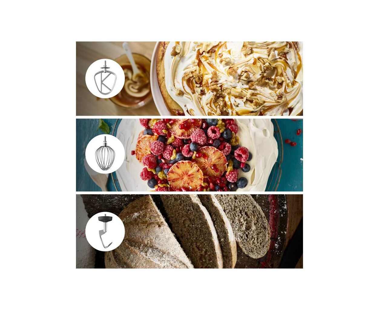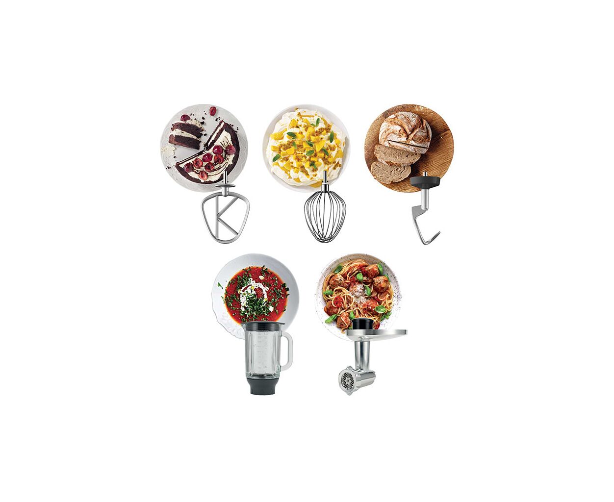 У стандартній комплектації представлені 3 основні насадки (К-подібна, віночок та гак для тесту) та насадки для приводів (блендер та м'ясорубка).