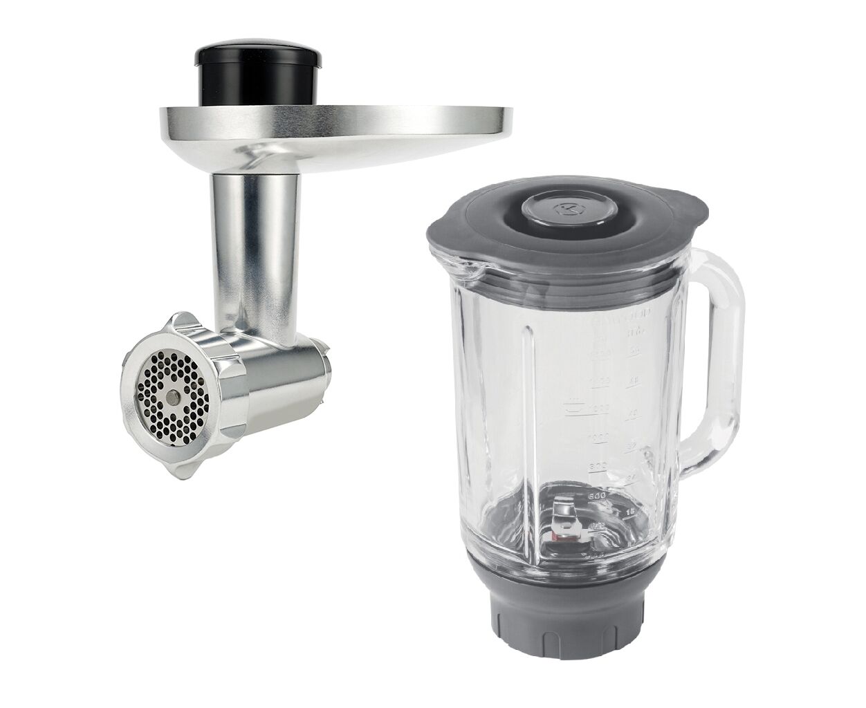 • Блендер. Закрита скляна чаша, що містить до 1,6 л. Допускається змішування гарячих та сильно охолоджених інгредієнтів. Блендер підключається до верхнього приводу і працює від мотора кухонної машини, оснащений власними ножами, що знімаються з нержавіючої сталі.