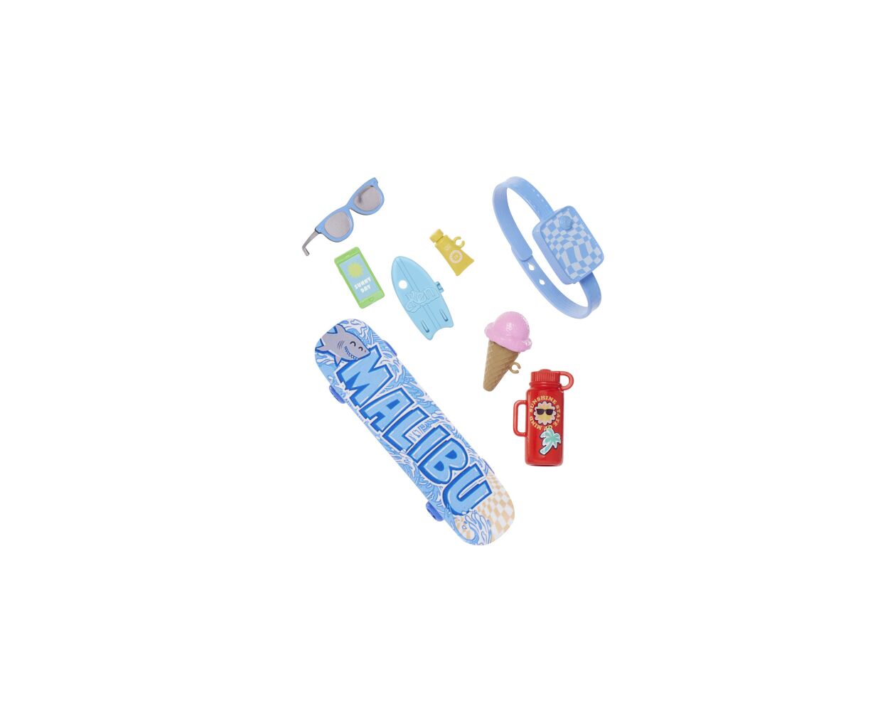 • кен, скейтборд для динамічних сюжетів, пляшка для води, сонцезахисний крем, телефон та серфбордний чохол для нього, сумка через плече, сонцезахисні окуляри, ріжок морозива