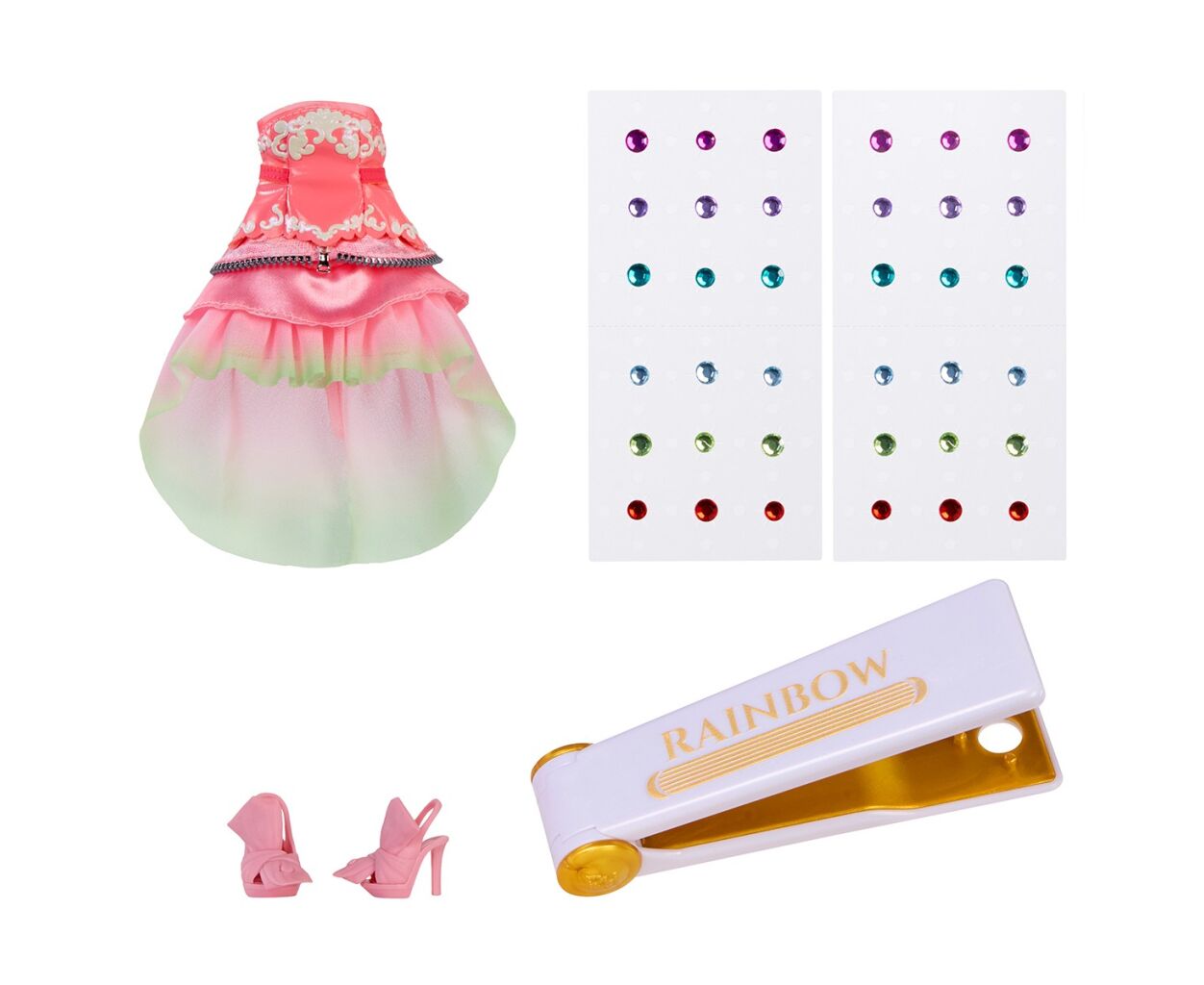 - Лялька, комплект одягу, пара взуття, 2 аркуші наліпок з камінцями, щипці для волосся, інструкція